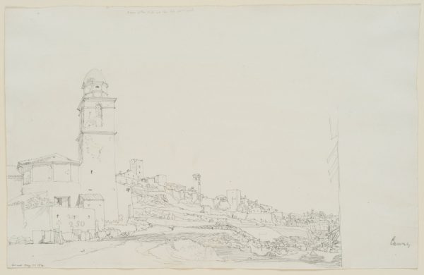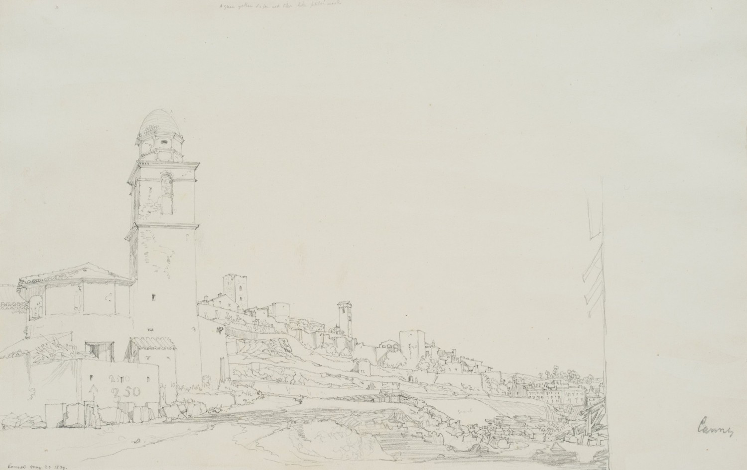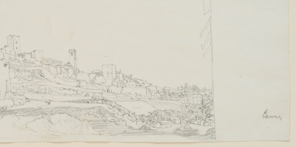 - Description: The drawing was made on a journey that took the English architect, cartographer, archaeological writer, art collector, numismatist and literary translator William Barnard Clarke to France between 1838 and 1839 and later on to Italy in 1839. It shows a view of the houses of Cannes with the medieval building “La Castre” in the middle ground.