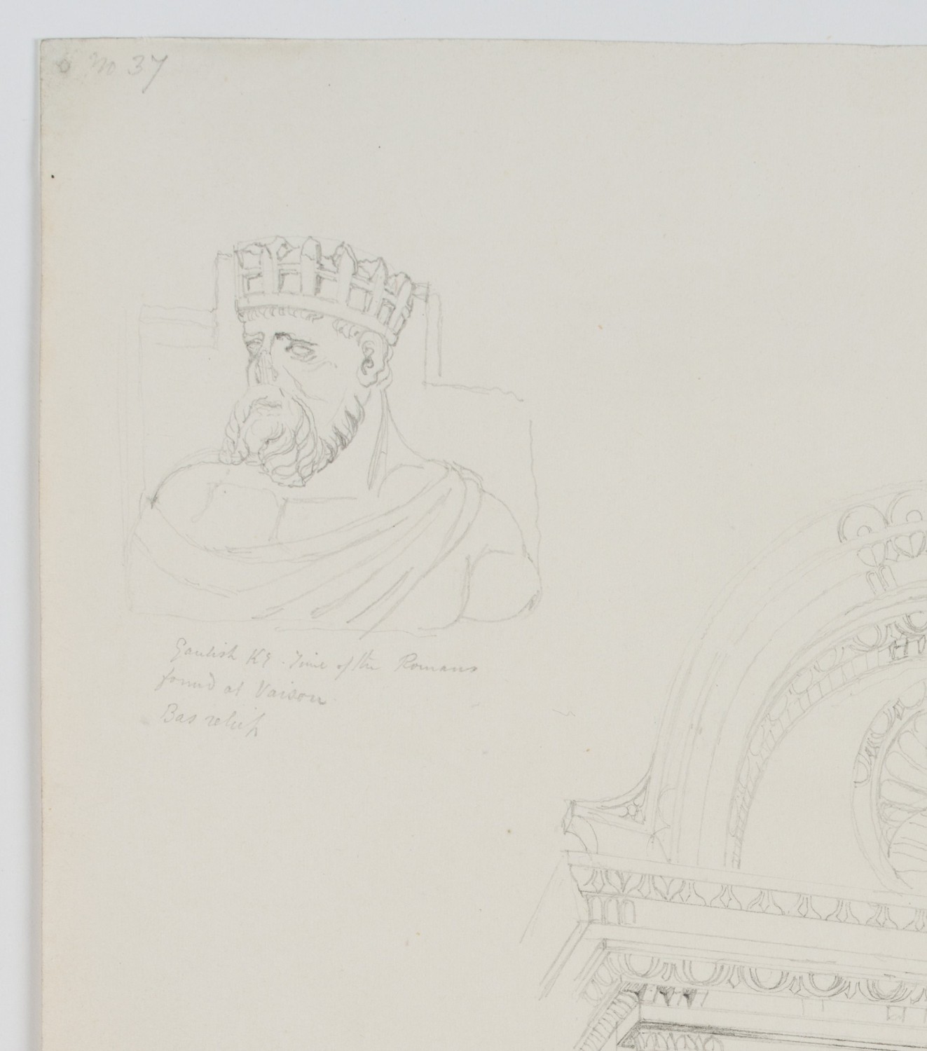 - Inscription: Numbered at upper left: “No 37”, partly indistinctly inscribed below: “[…]of the Romans/found at Vaison/Bas relief”, inscribed at centre left, inscribed at centre right.