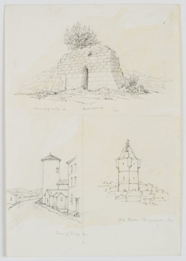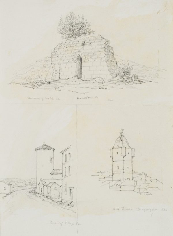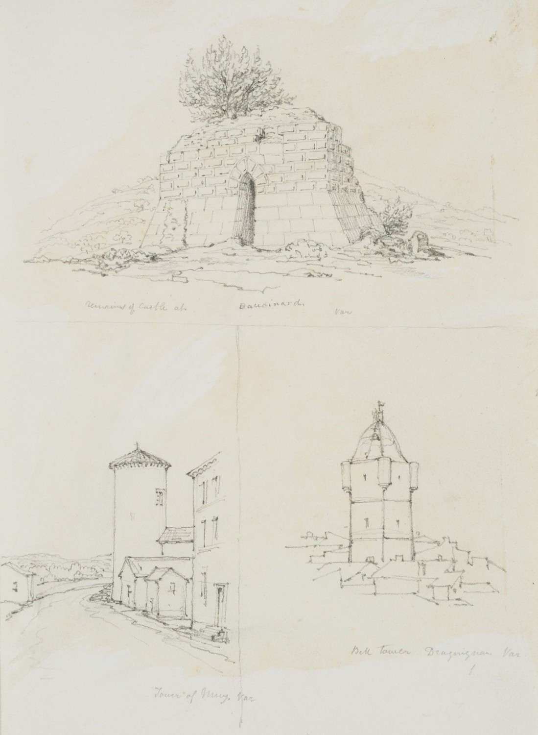 William Barnard Clarke (1806 Cheshunt, Hertfordshire – 1865 Freiburg im Breisgau), Tour de l’Horloge in Draguignan, ruins of Sabran Castle in Beaudinard and the Tour Charles Quint in Le Muy, c. 1830, Pencil