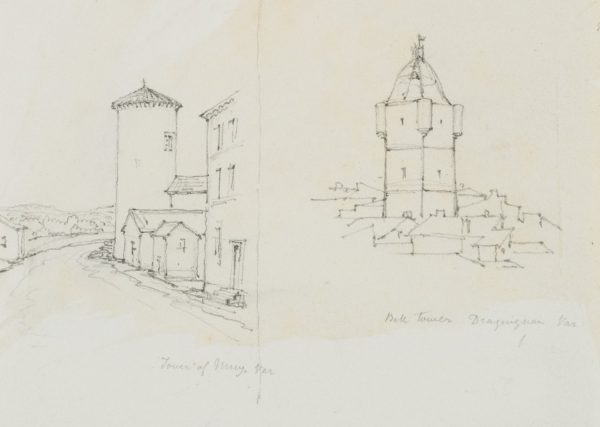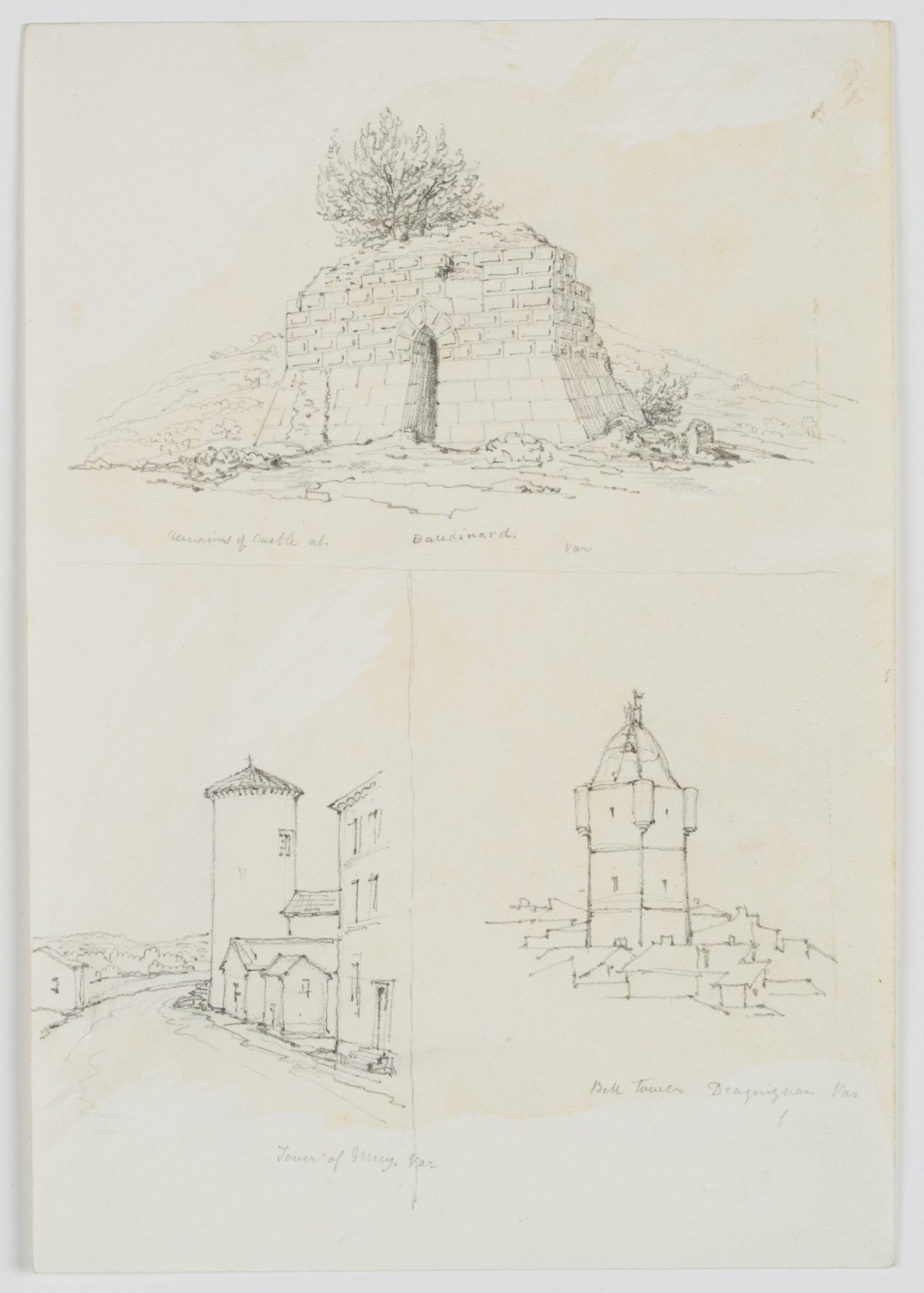 - Description: The drawing was made on a journey that took the English architect, cartographer, archaeological writer, art collector, numismatist and literary translator William Barnard Clarke to France between 1838 and 1839 and later on to Italy in 1839. In the three depictions of towers in the south of France (17th-century Tour de l’Horloge in Draguignan, 14th-century ruins of Sabran Castle in Beaudinard and 13th-century Tour Charles Quint in Le Muy), the architect pays particular attention to the exact reproduction of structural details and the embedding of the buildings in their urban context.