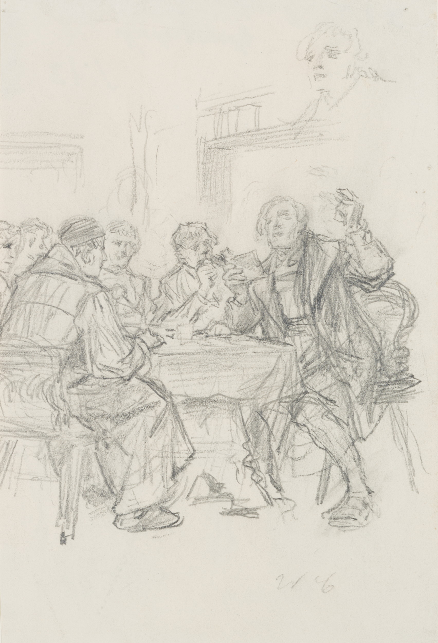 • Beschreibung: Studie mit Blick in einen Gastraum, in dem an einem Tisch einige Herren rauchend und trinkend dem ganz vorne Sitzenden lauschen, der einen Text vorliest.