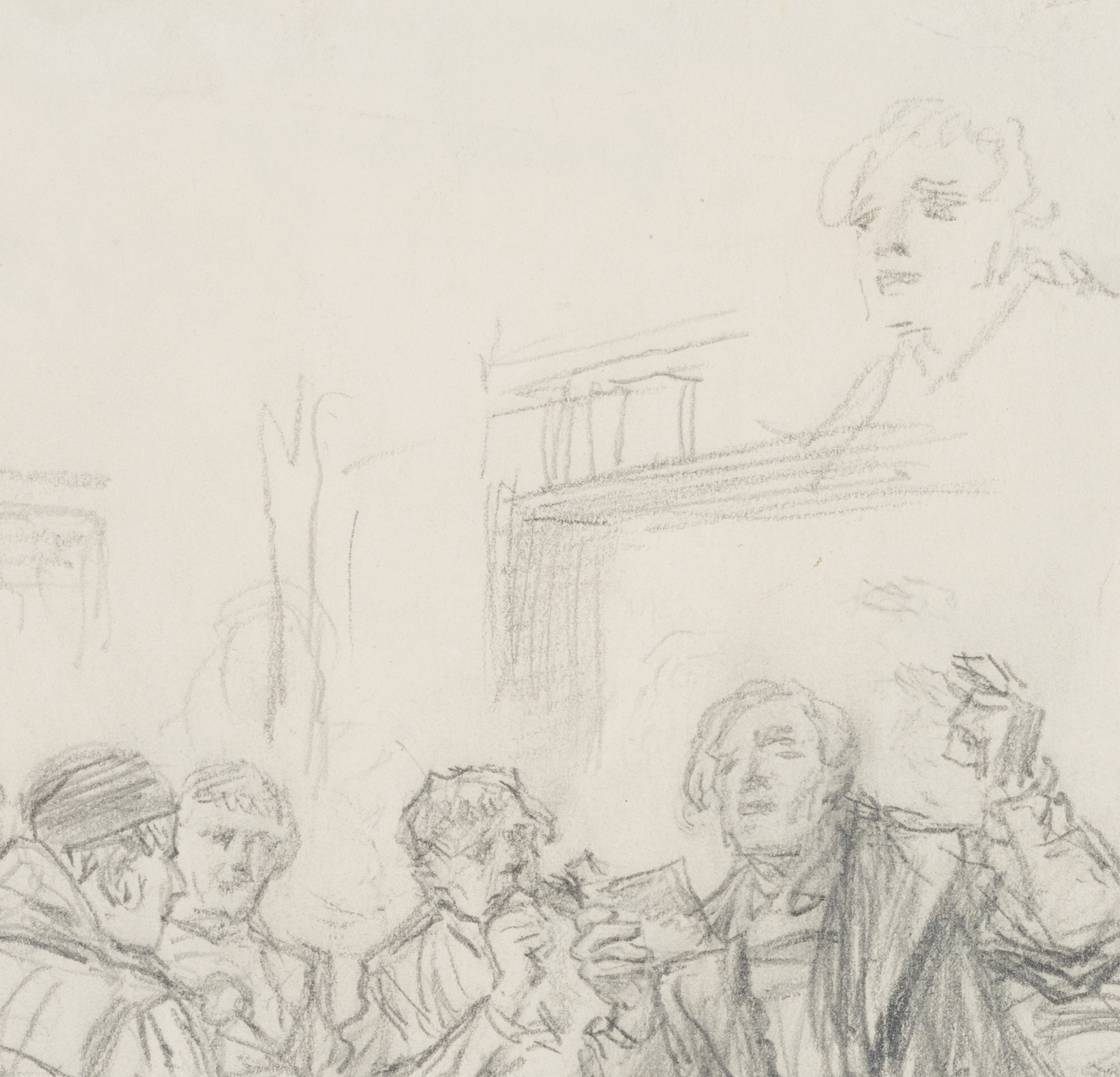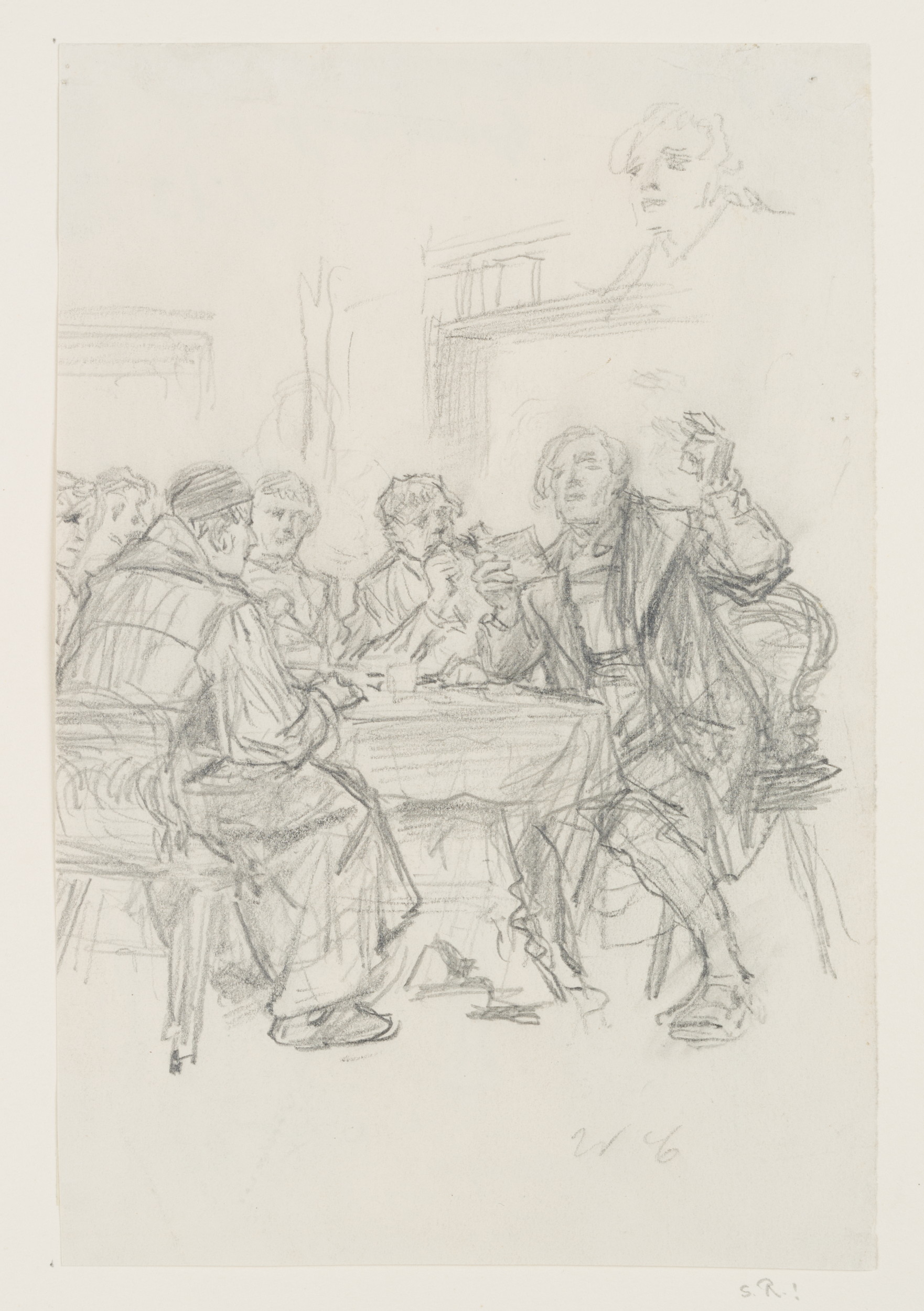 • Description: Study with a view into a dining room where a few gentlemen at a table are smoking and drinking while listening to the person sitting at the front reading a text.