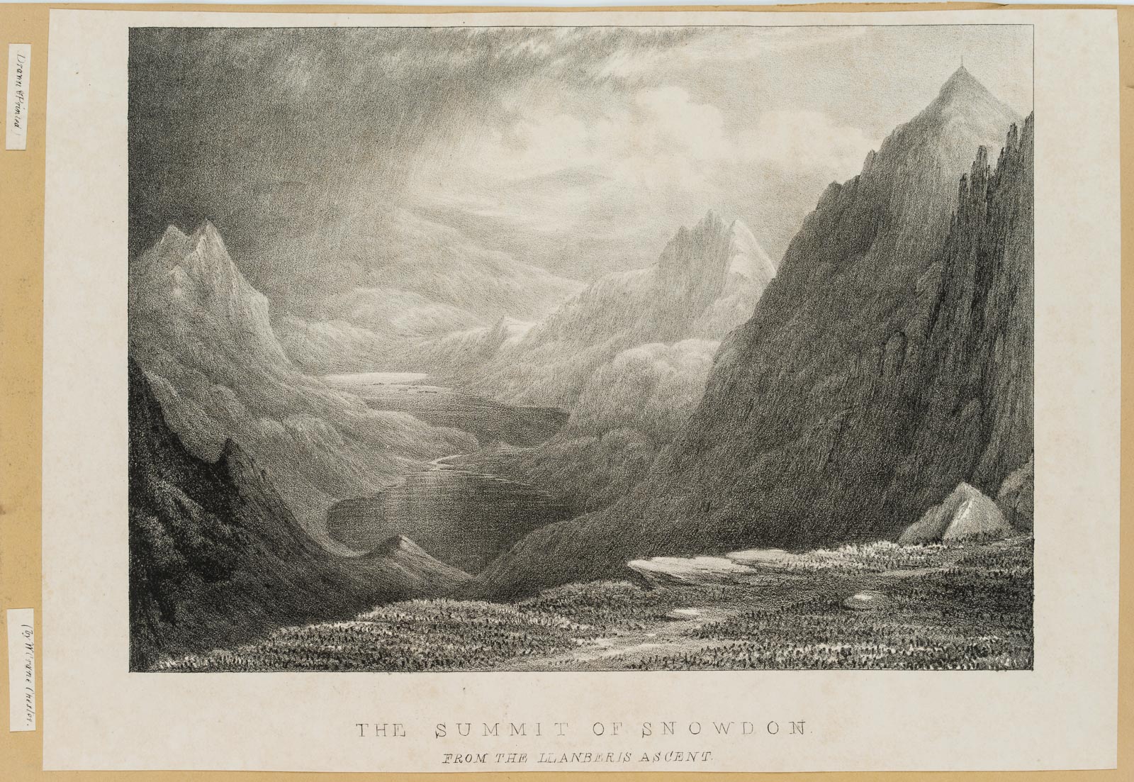 • Inscription: Inscribed “THE SUMMIT OF SNOWDON | FROM THE LLABERIS ASCENT” below the print. Next to the right side two paper strips inscribed with the signature: “Drawn & Printet | by W Crane Chester”.