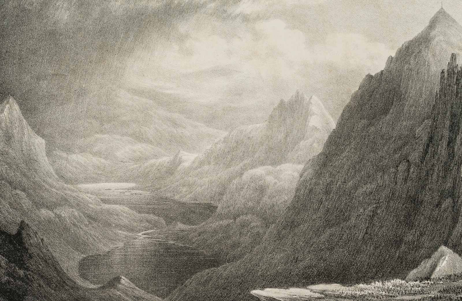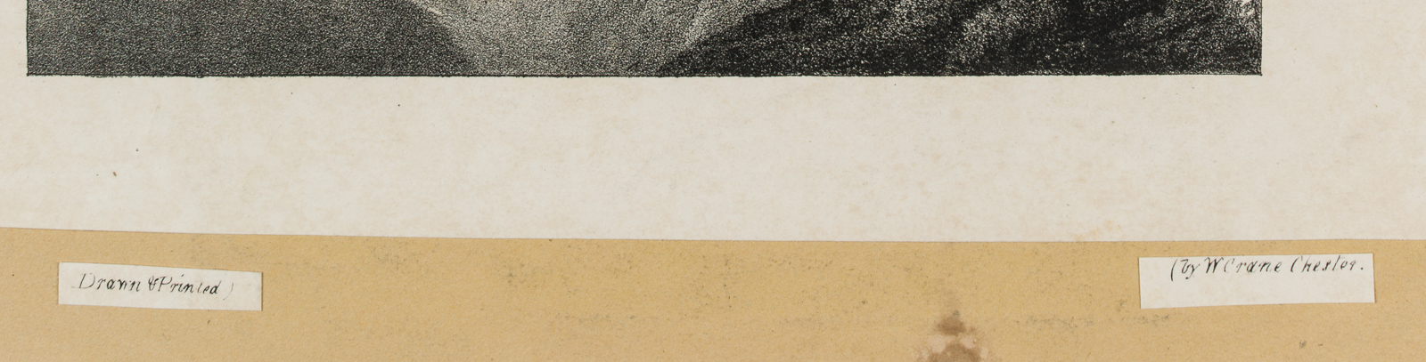 • Bezeichnung: Unterhalb der Graphik beschriftet mit “THE SUMMIT OF SNOWDON | FROM THE LLABERIS ASCENT”. Neben der rechten Seite kleben zwei mit der Signatur beschriftete Papierstreifen: “Drawn & Printet | by W Crane Chester”.