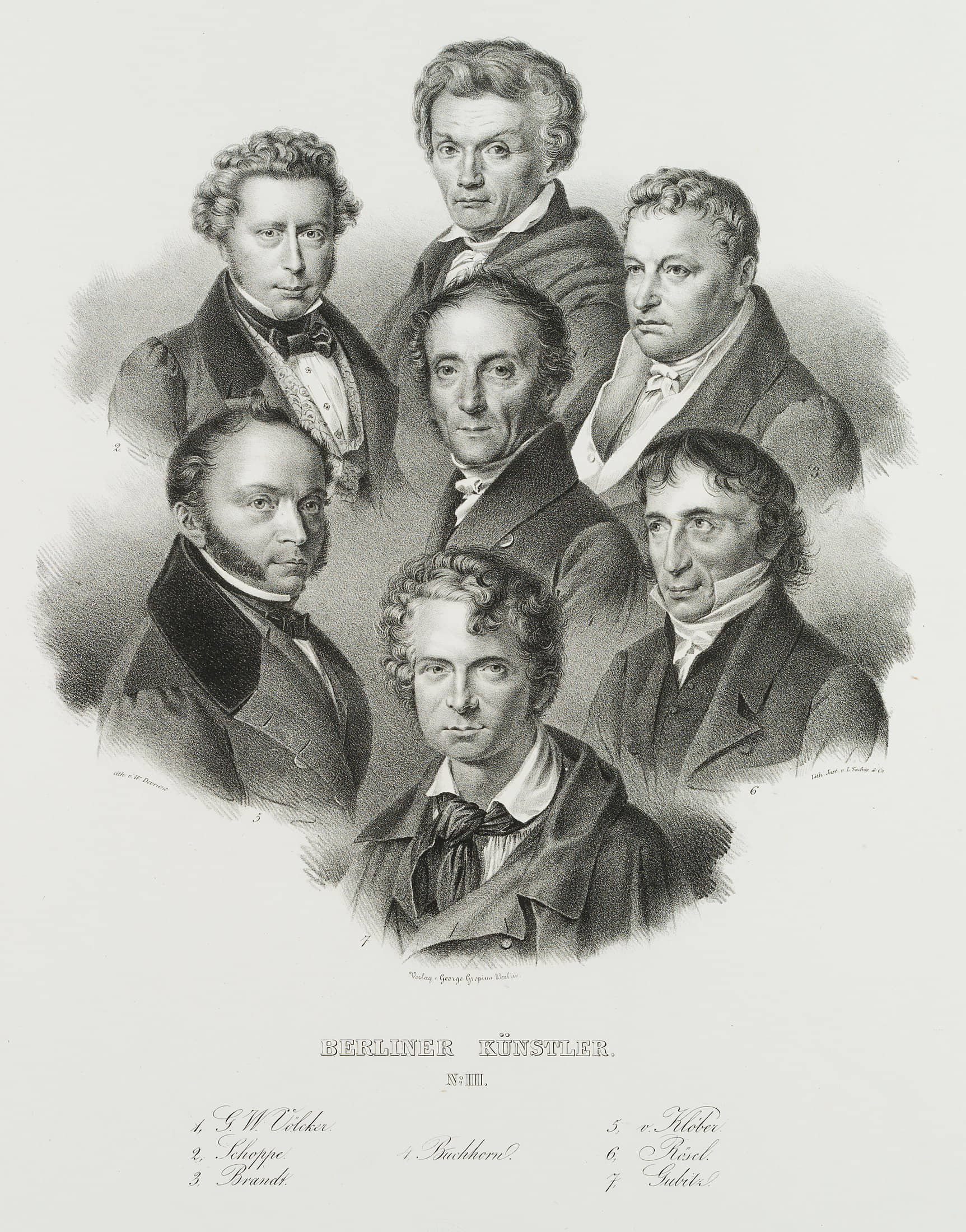 - Beschreibung: Jeweils Brustbilder von Berliner Künstlern des 19. Jahrhunderts: Gottfried Wilhelm Völcker (1775 Berlin-1849 ebenda), Julius Schoppe (1795 Berlin-1868 ebenda), Brandt, Karl Ludwig Bernhard Christian Buchhorn (1770 Halberstadt-1856 Berlin), Carl Friedrich August von Kloeber (1793 Breslau-1864 Berlin), Johann Gottlob Samuel Rösel (1768 oder 1769 Breslau-1843 Potsdam) und Friedrich Wilhelm Gubitz (1786 Leipzig-1870 Berlin).