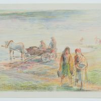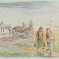 Werner Diez (1906 Kempen – 1979 Schorndorf), On the Dniyepr near Orscha, women and horse-drawn carriage with two workers on the river, Belarus, 1941, Colored pencil