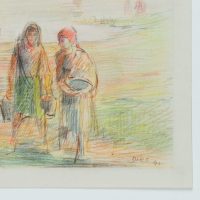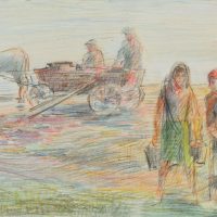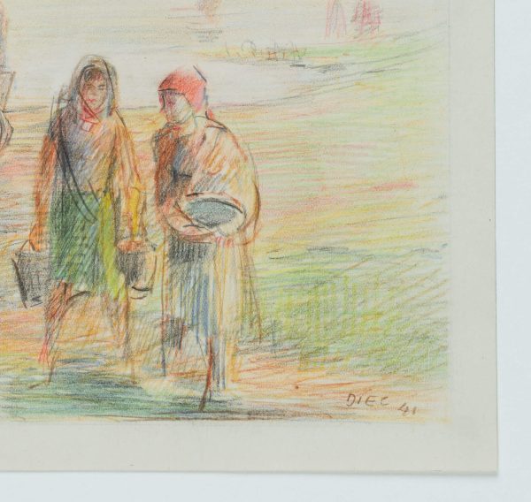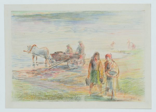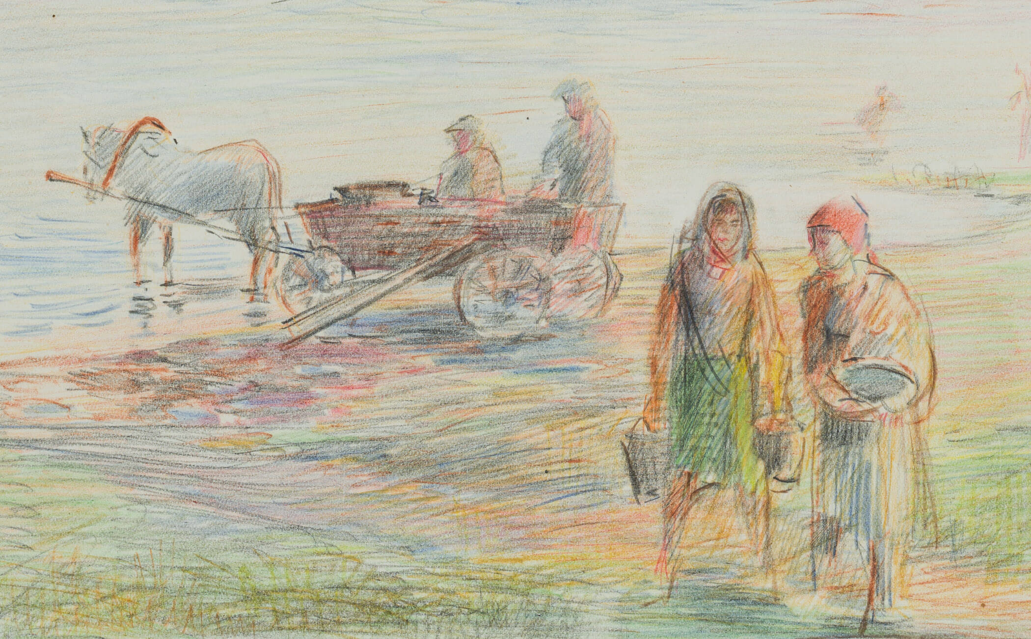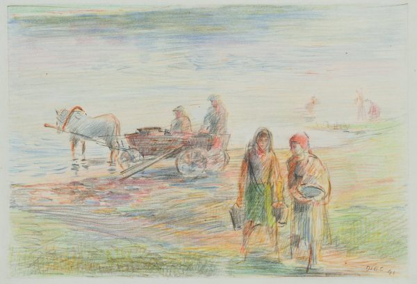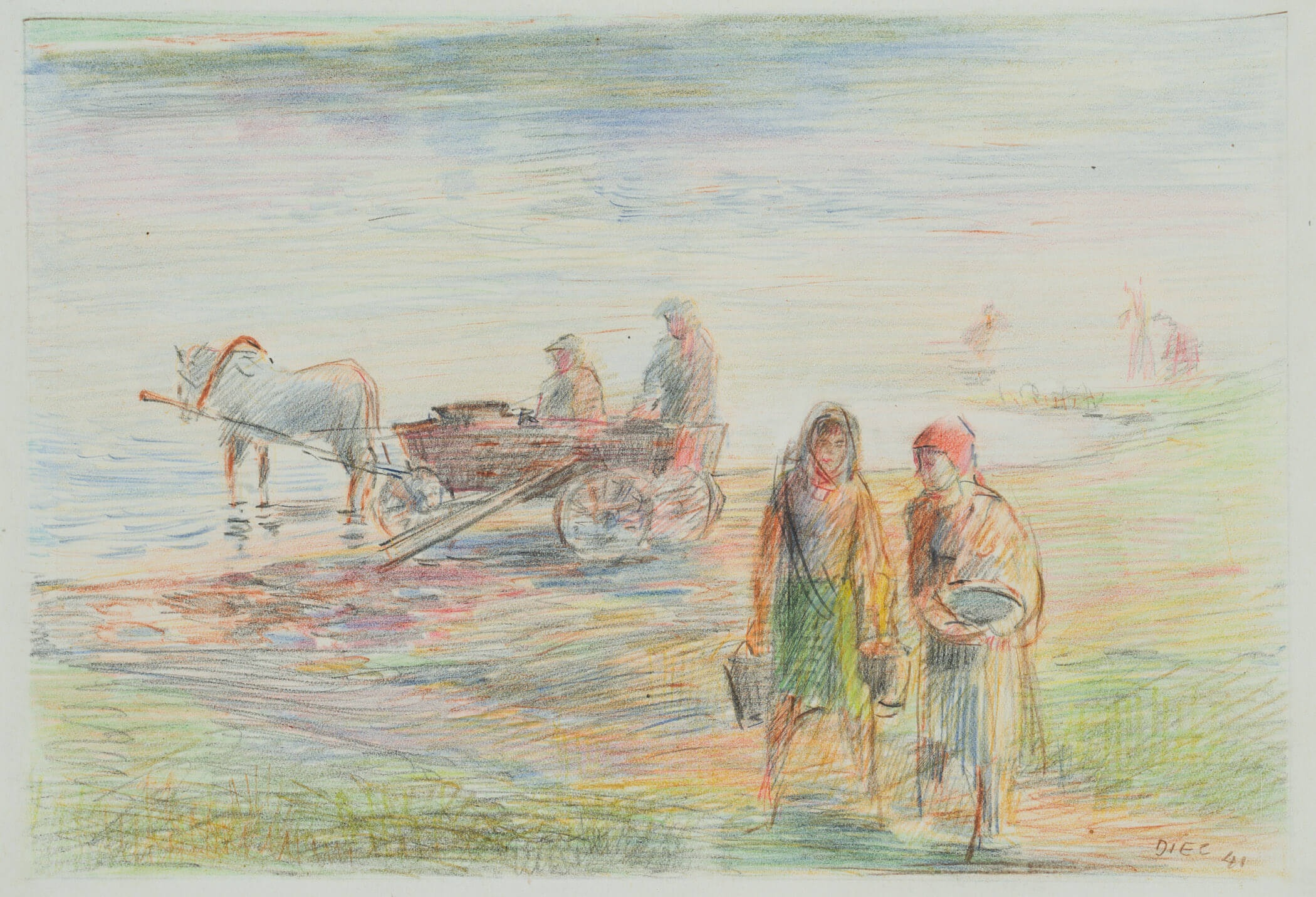 Werner Diez (1906 Kempen – 1979 Schorndorf), Am Dniyepr bei Orscha, Frauen und Pferdekutsche mit zwei Arbeitern am Fluss, Weißrussland, 1941, Buntstift