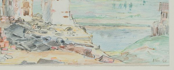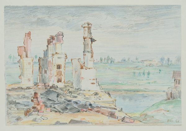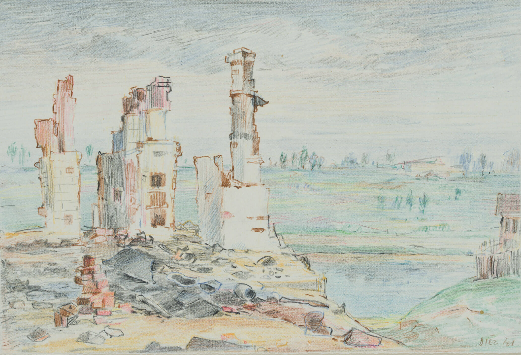 - Description: During the Second World War, Orscha was captured by German troops on 16 July 1941. The occupiers established a forced ghetto for the Jewish inhabitants of the town and the surrounding area. On 26 and 27 November 1941, 1800 people were murdered by a German commando unit. Surprisingly, Werner Diez’s pastels and watercolours rarely tell of the war in the East. This sheet is one of the few showing the destruction of war. Signed and dated lower right.