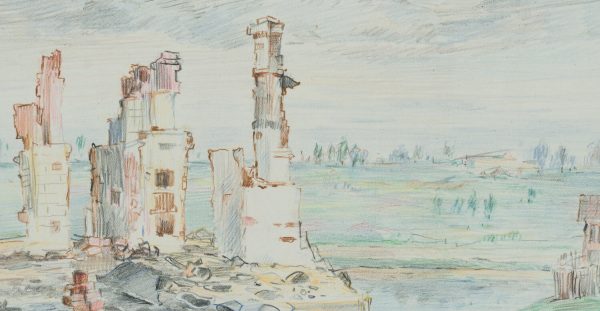 Werner Diez (1906 Kempen – 1979 Schorndorf), View of ruins and wall remains in Orscha, Belarus, 1941, Colored pencil