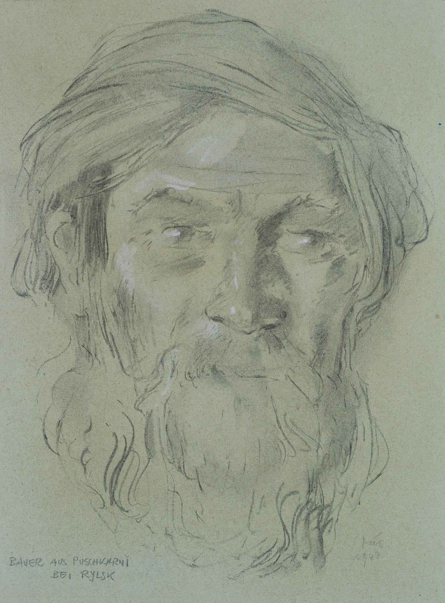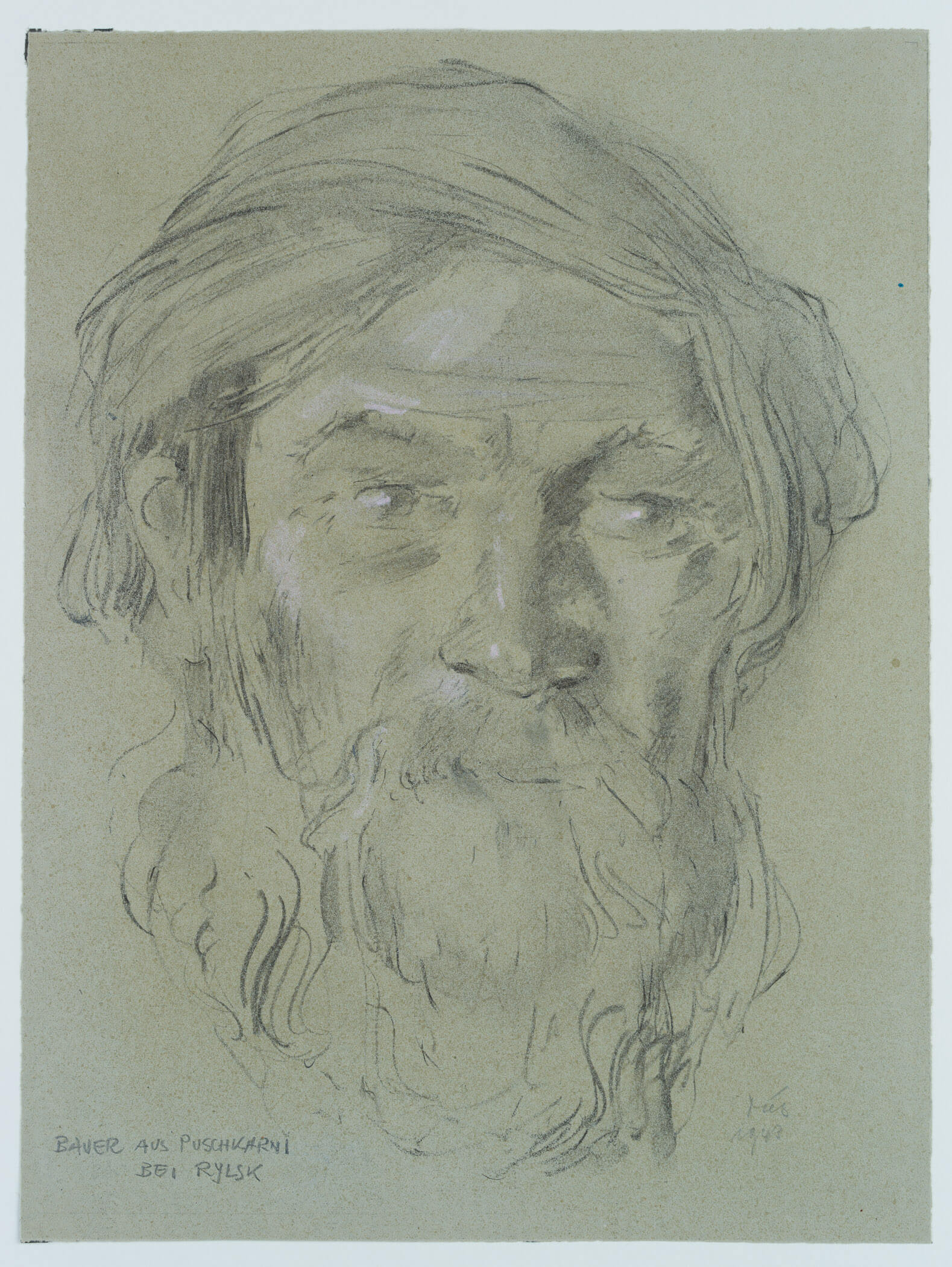 Werner Diez (1906 Kempen – 1979 Schorndorf), Frontale Kopfstudie eines bärtigen Mannes, Bauer aus Puschkarni bei Rylsk, Oblast Kursk, Russland, 1943, Kohle