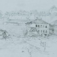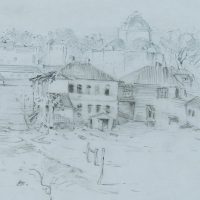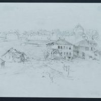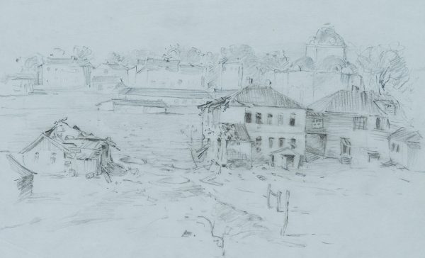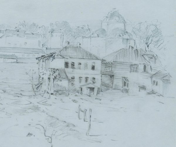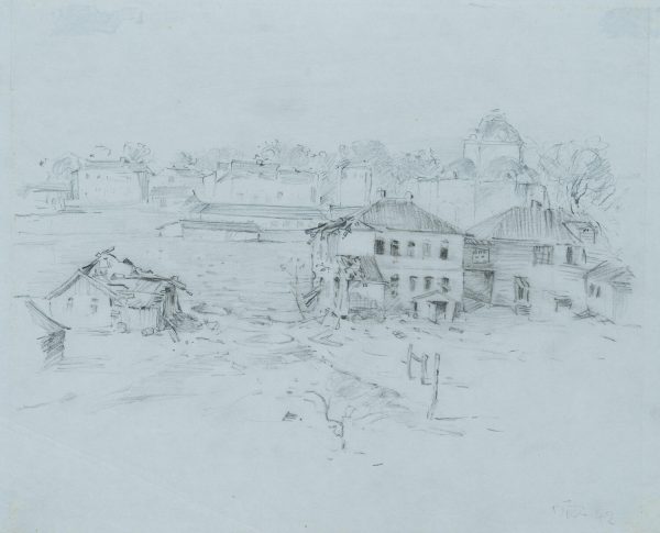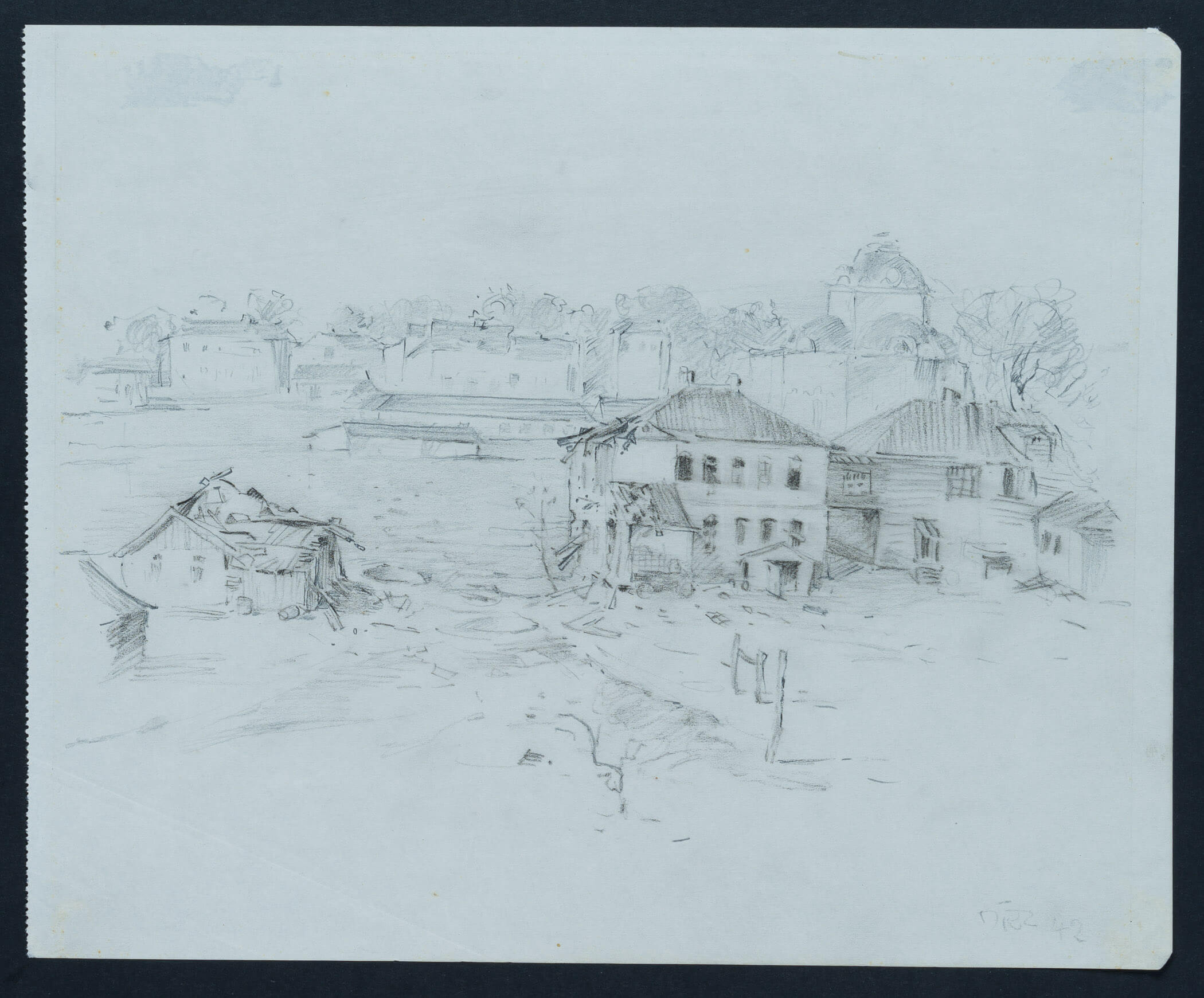 Werner Diez (1906 Kempen – 1979 Schorndorf), Our house in Shchigry. After the attack in July 1942, view of the houses destroyed by the Russian army in the town of Shchigry, Kursk Oblast, Russia., 1942, Pencil
