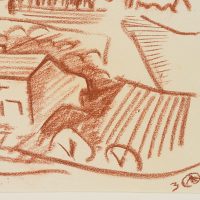 - Beschreibung: Wunderbare, lockere Landschaftskizze, in der der Künstler mit prägnantem Strich jene ländliche Gegend mit einigen Häusern und Feldern charakterisiert. Werner Drewes studierte in den 20er Jahren am Bauhaus in Weimar unter anderem bei Paul Klee, Wassily Kandinsky, Johannes Itten, Lyonel Feininger und László Moholy-Nagy. Er unternahm Reisen in Europa, Nordamerika und Asien. 1930 verließ Drewes Deutschland und ging nach New York City, wo er unter anderem an der Columbia University lehrte. Ab 1946 Professur für Design an der Washington University in St. Louis und Freundschaft zu Max Beckmann.