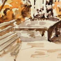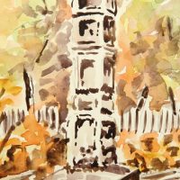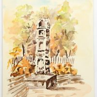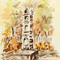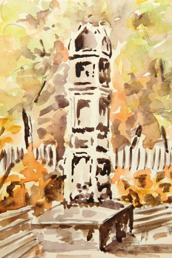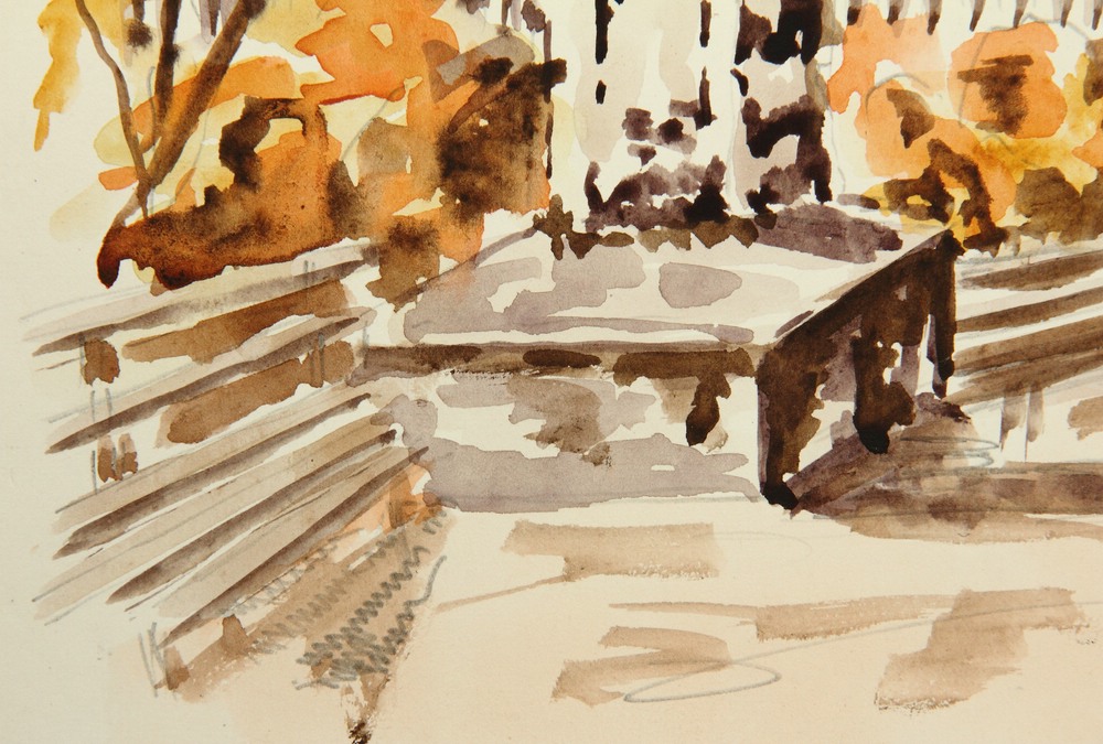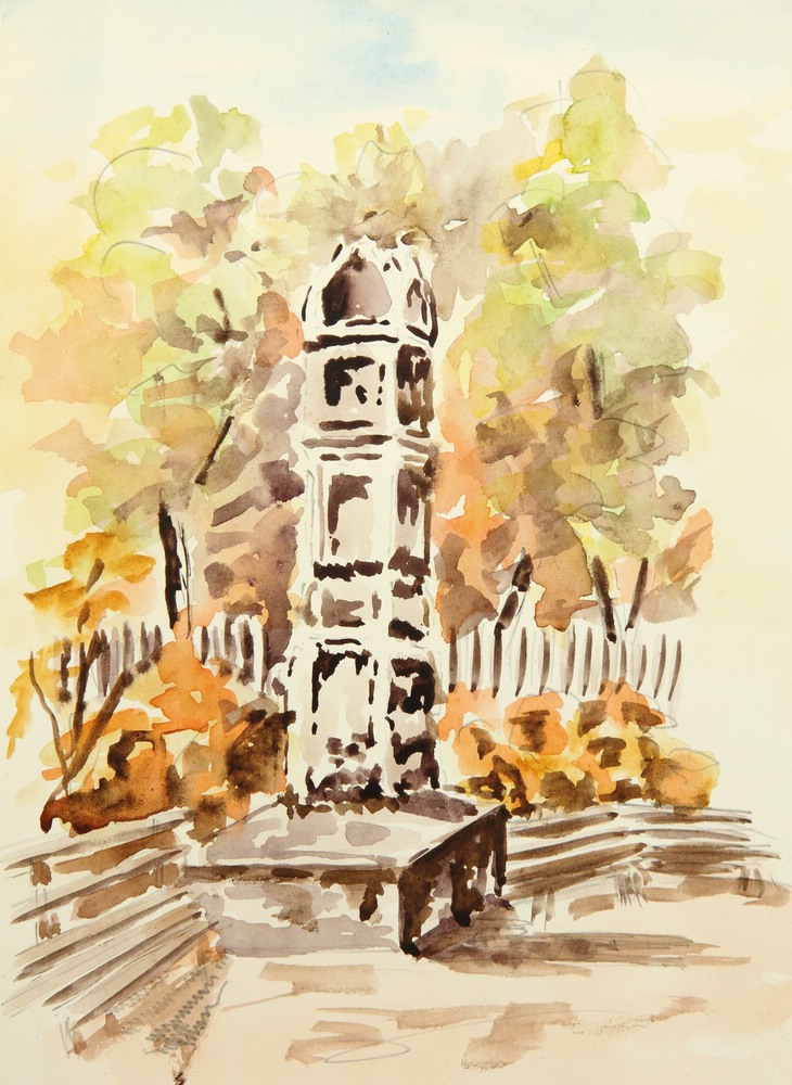 - Description: Watercolor over preliminary drawing in pencil on strong paper. Stone columnar monument between some park benches in front of autumn colored trees and shrubs.