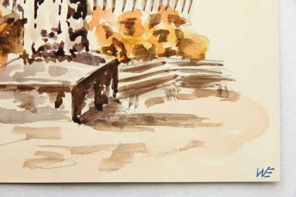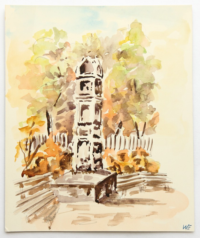 - Beschreibung: Aquarell über Vorzeichnung in Bleistift auf festem Papier. Steinernes, säulenartiges Monument zwischen einigen Parkbänken vor herbstlich verfärbten Bäumen und Sträuchern.