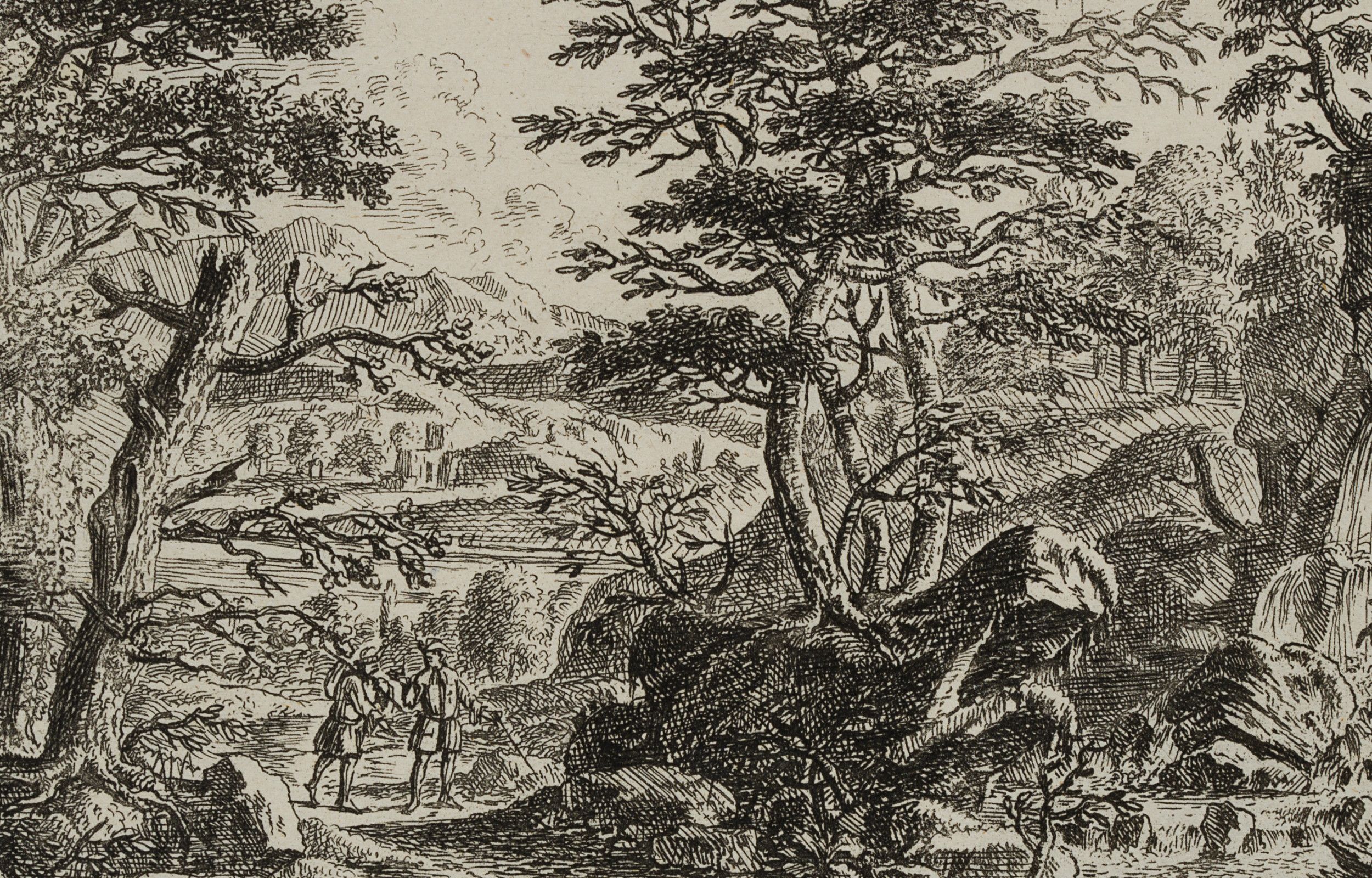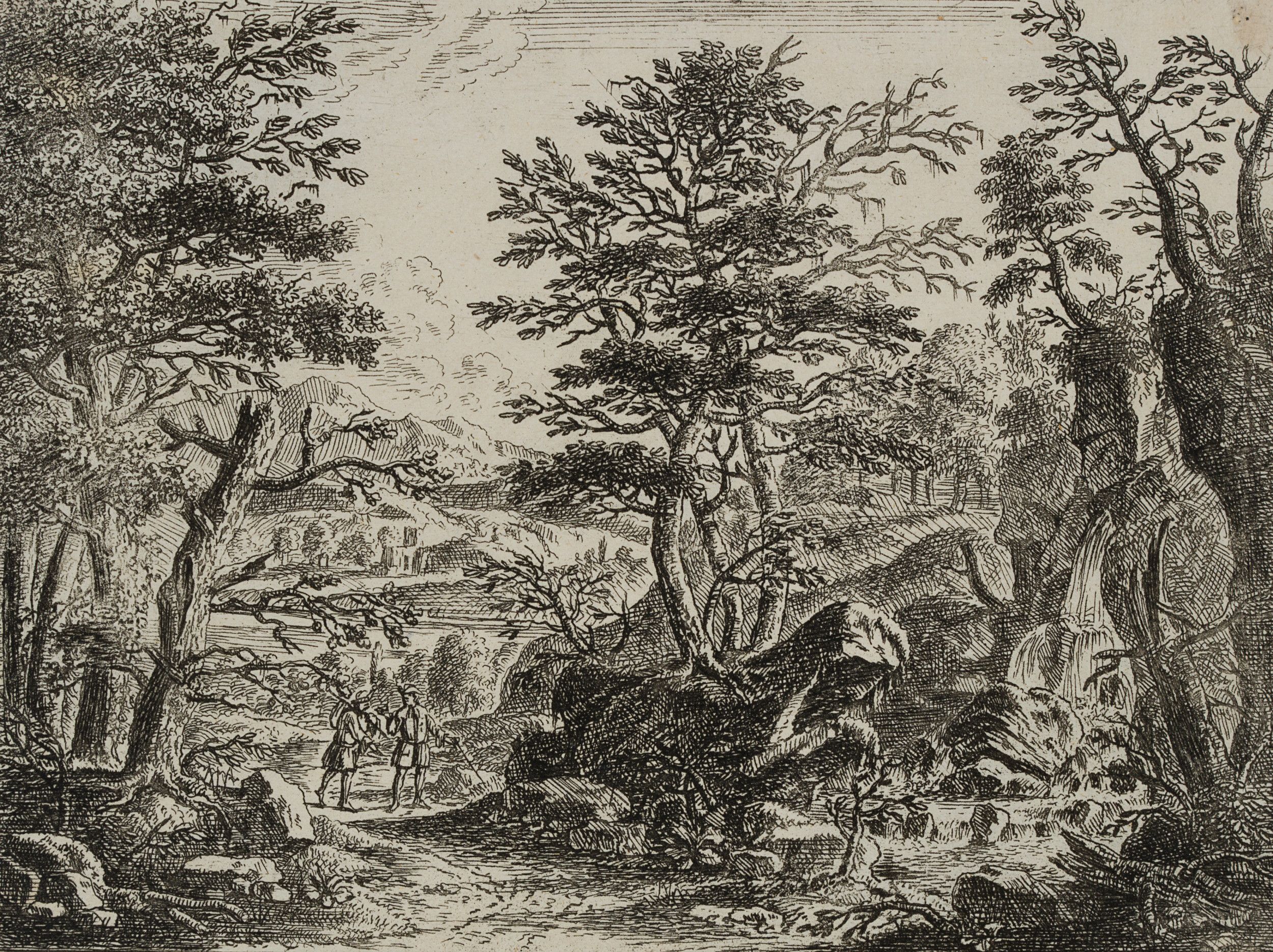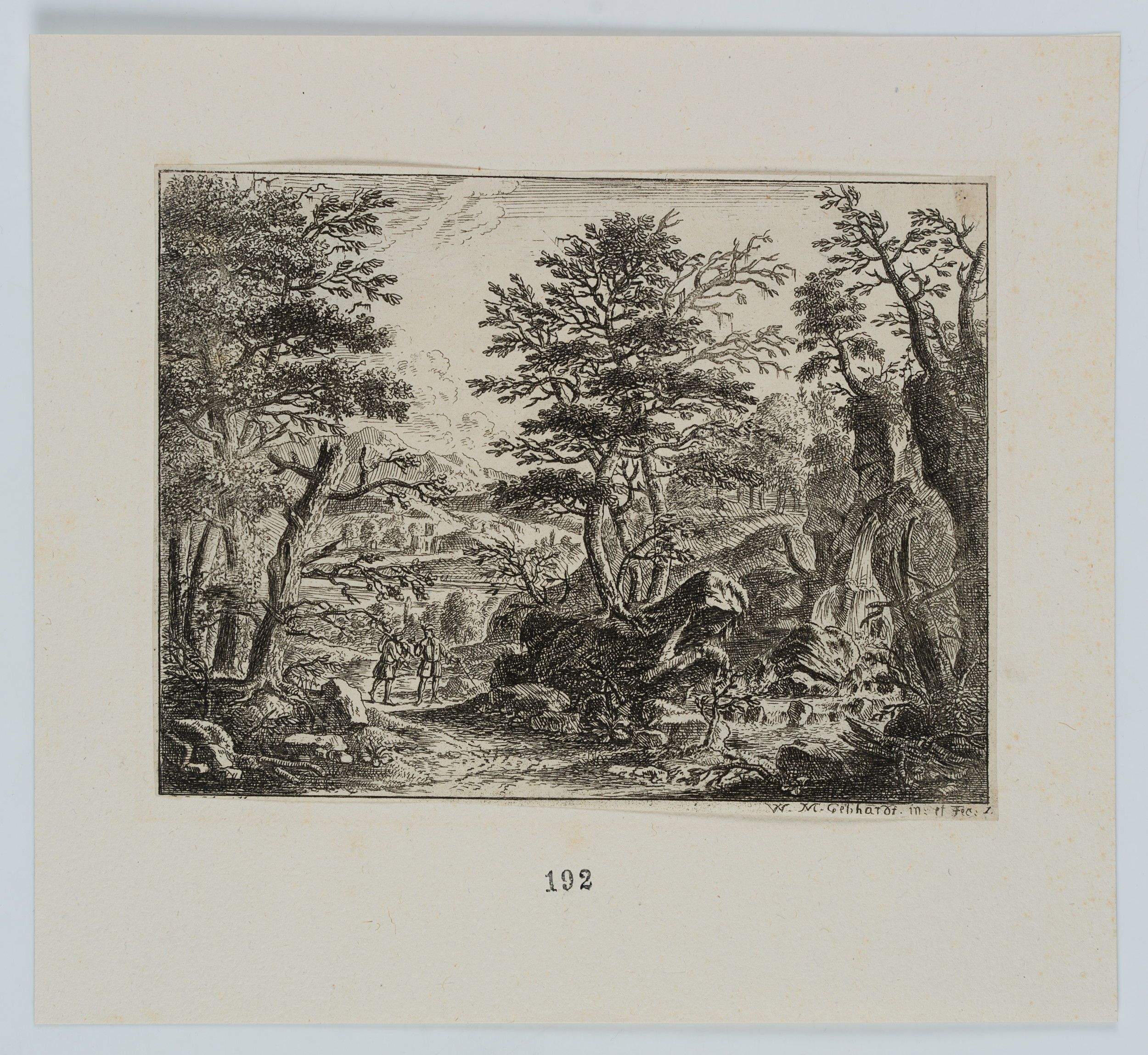 Wolfgang Magnus Gebhard (1683 – 1755 ), Rocky forest with two hikers, c. 1750, Etching