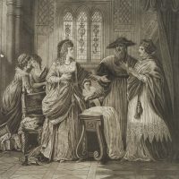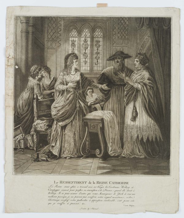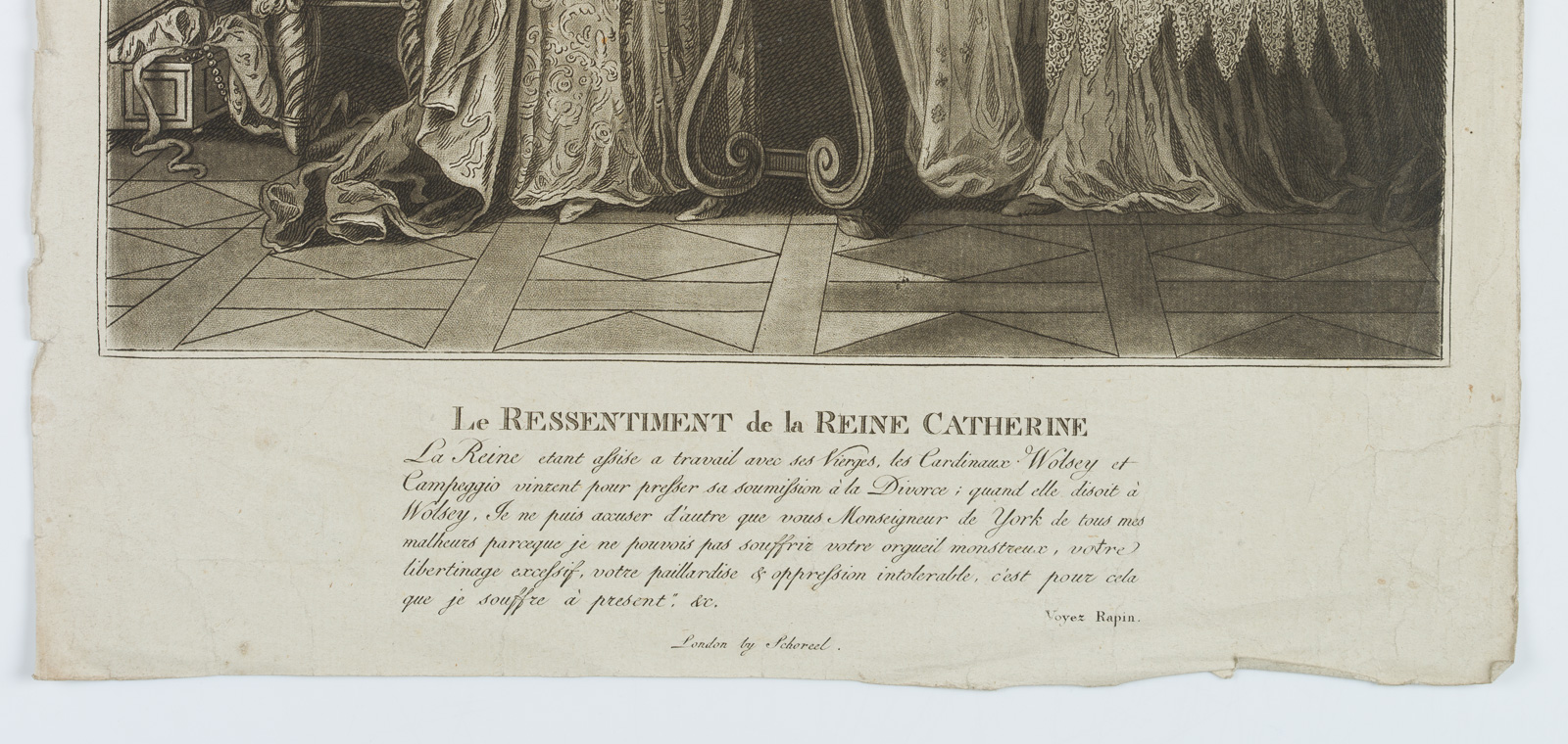 - Bezeichnung: Unterhalb betitelt, darunter mit Angaben zum Kontext der Szene. Das Blatt zeigt eine Interieurszene, in der sich Katharina den Kardinälen Wolsey und Campeggi widersetzt, die sie dazu drängen, die Heirat mit Heinrich VIII. aufzulösen.