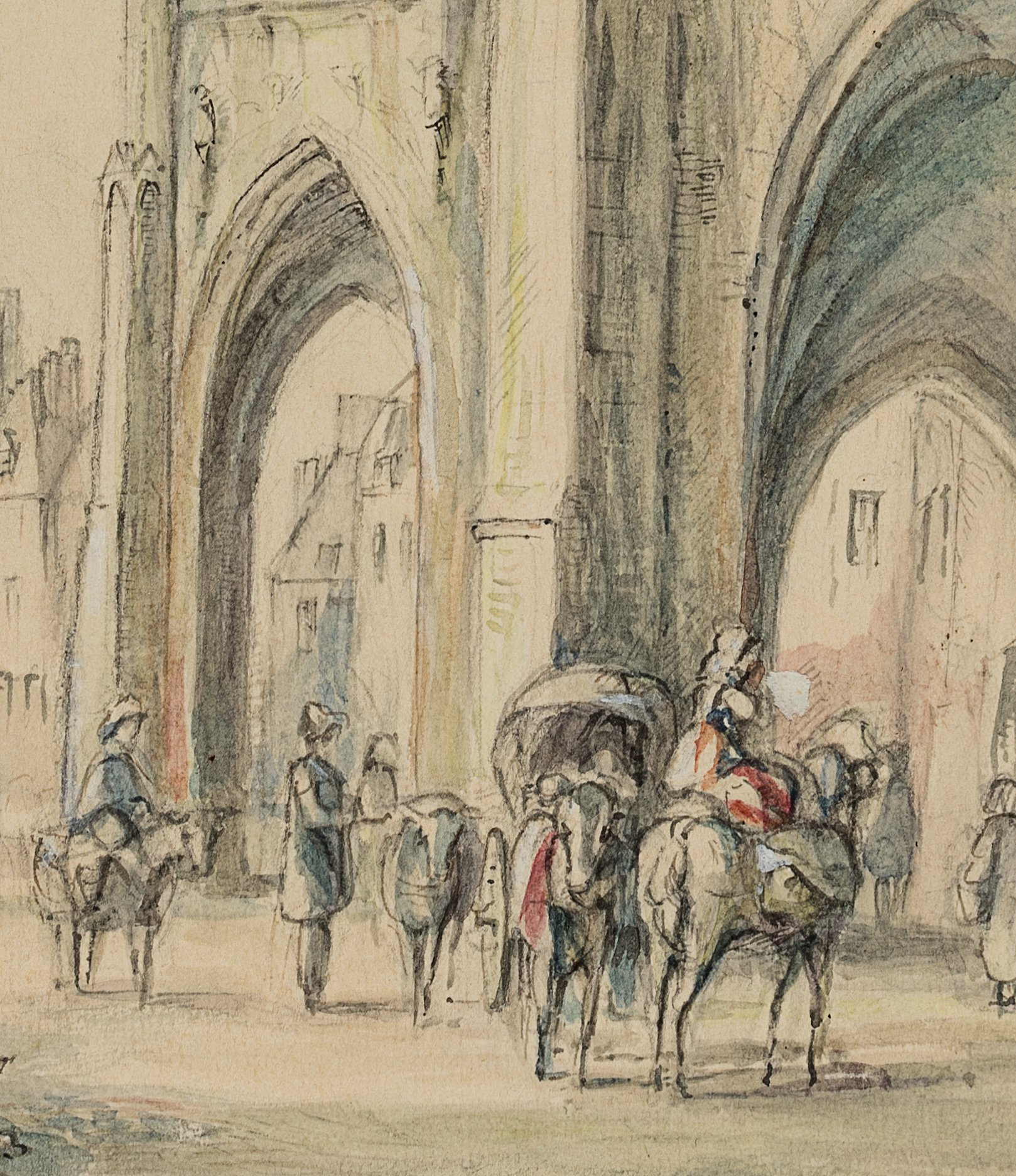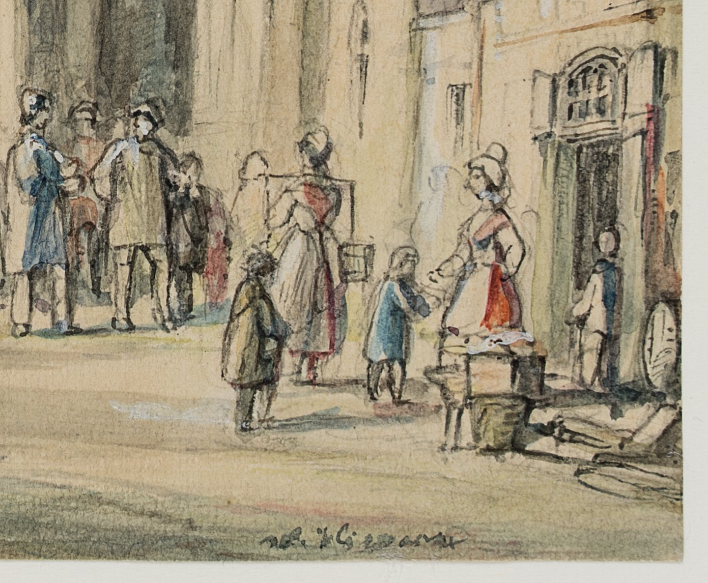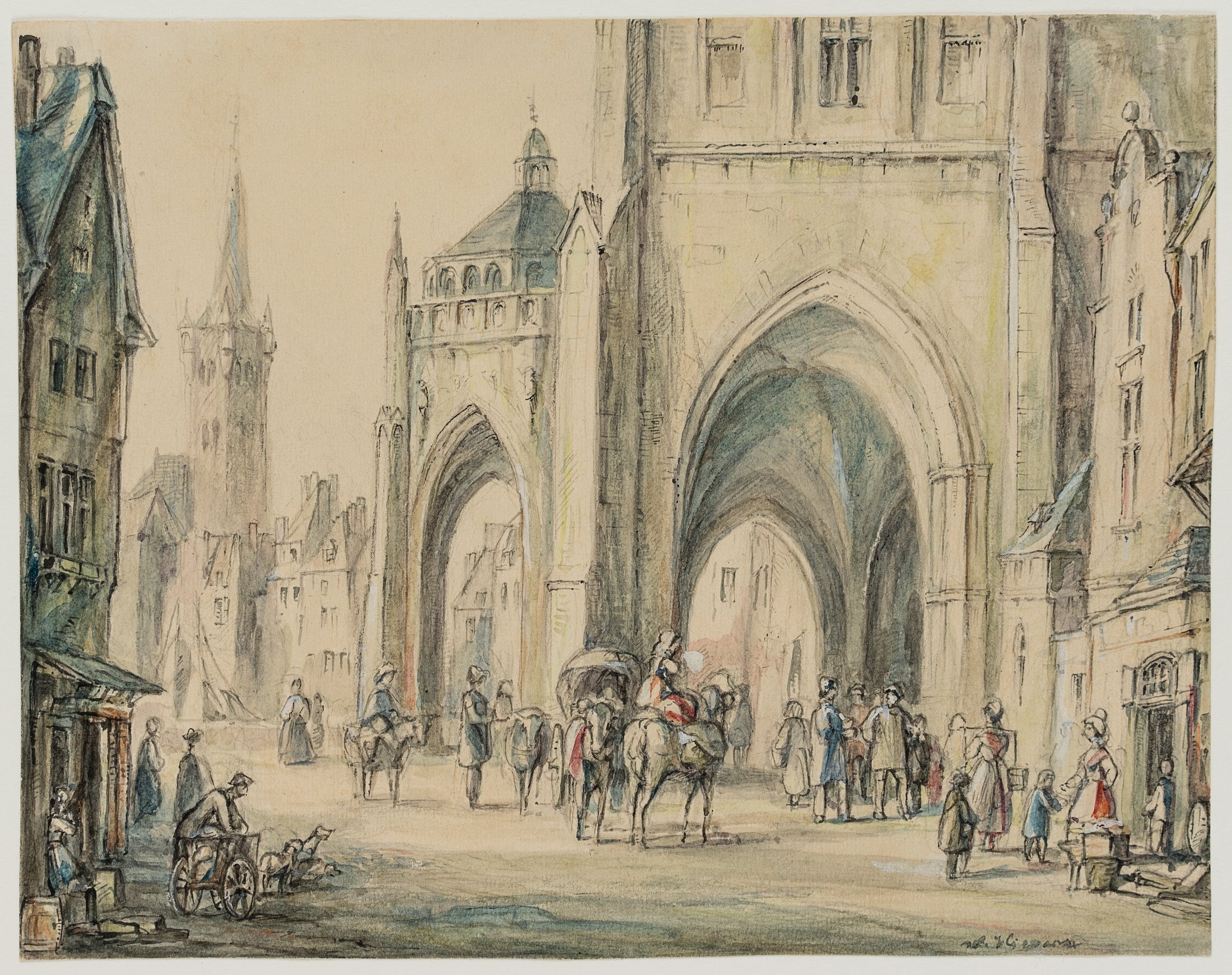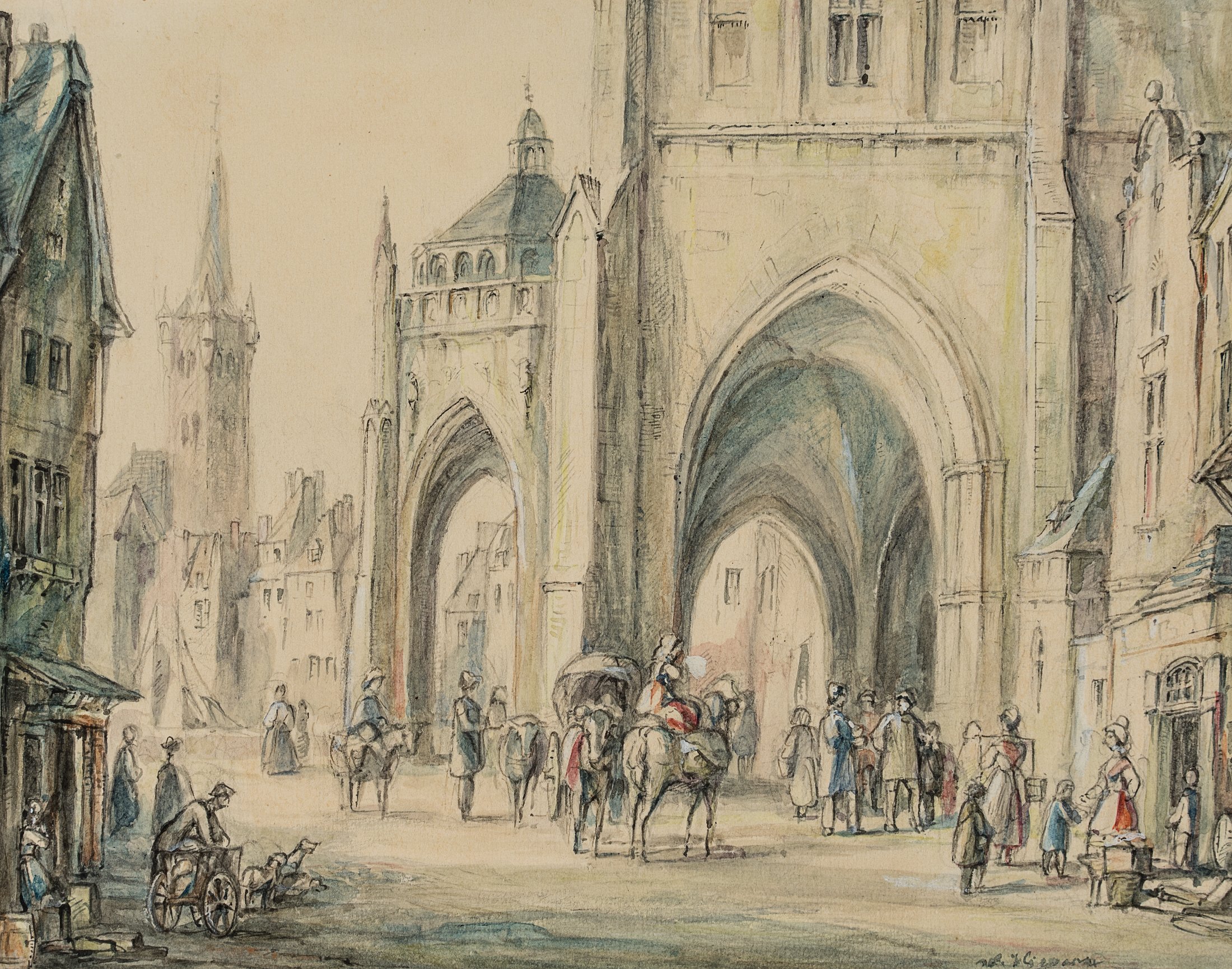 Woldemar Hermann (1807 Dresden – 1878 ebd.), Reges Treiben vor einer Kathedrale, 19. Jahrhundert, Aquarell