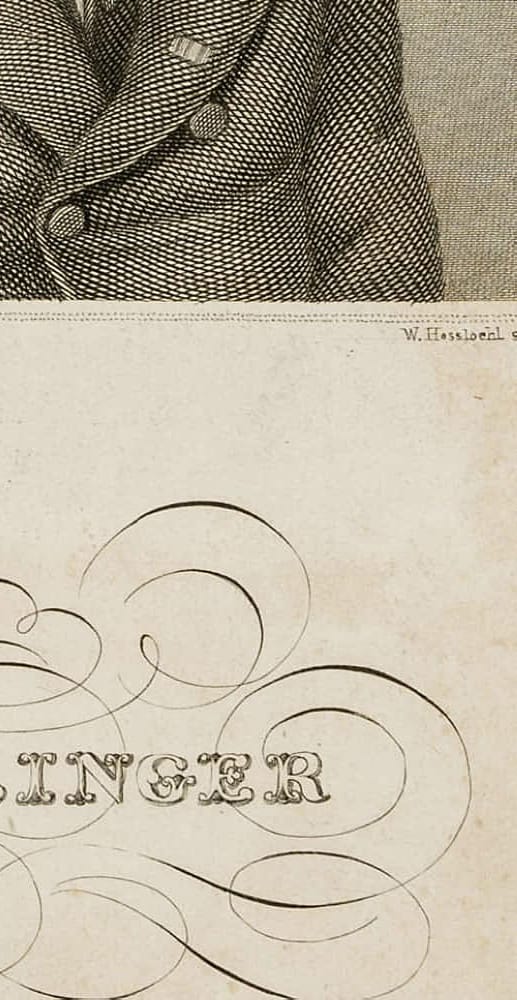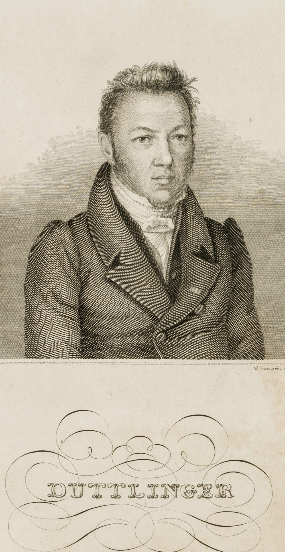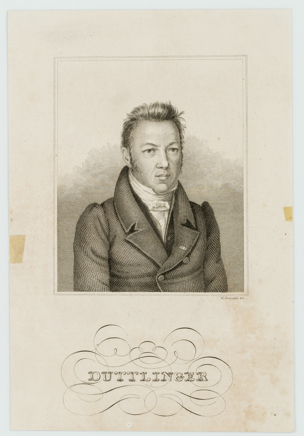 - Bezeichnung: Unterhalb der Darstellung in der Druckplatte vom Künstler “W. Hessloehl sc.” signiert und mit dem Namen des Dargestellten “DUTTLINGER” betitelt.