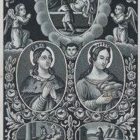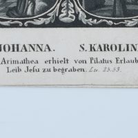 • Beschreibung: Der emblematische Aufbau des Blattes trägt oberhalb den Titel “Christus wird ins Grab gelegt”. Oval gerahmt und von andächtigen Engeln umgeben sehen wir mittig die ikonographische Szene der Beweinung Christi, die unterhalb von zwei Heilgendarstellungen der St. Johanna und der St. Karolina flankiert wird. Den unteren Abschluss des Bildes bildet der Vers aus dem Lucas Evangelium 23,53: “”Joseph v. Arimathea erhialt von Pilatus Erlaubniss, den Leib Jesu zu begraben.”.