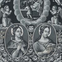 • Description: The emblematic structure of the sheet bears the title “Christ is laid in the grave” above. Framed in an oval and surrounded by devotional angels, we see the iconographic scene of the Lamentation of Christ in the centre, which is flanked below by two representations of the saints St. Joan and St. Caroline. At the bottom of the painting is the verse from the Gospel of Lucas 23:53: “Joseph of Arimathea obtains permission from Pilate to bury the body of Jesus”.