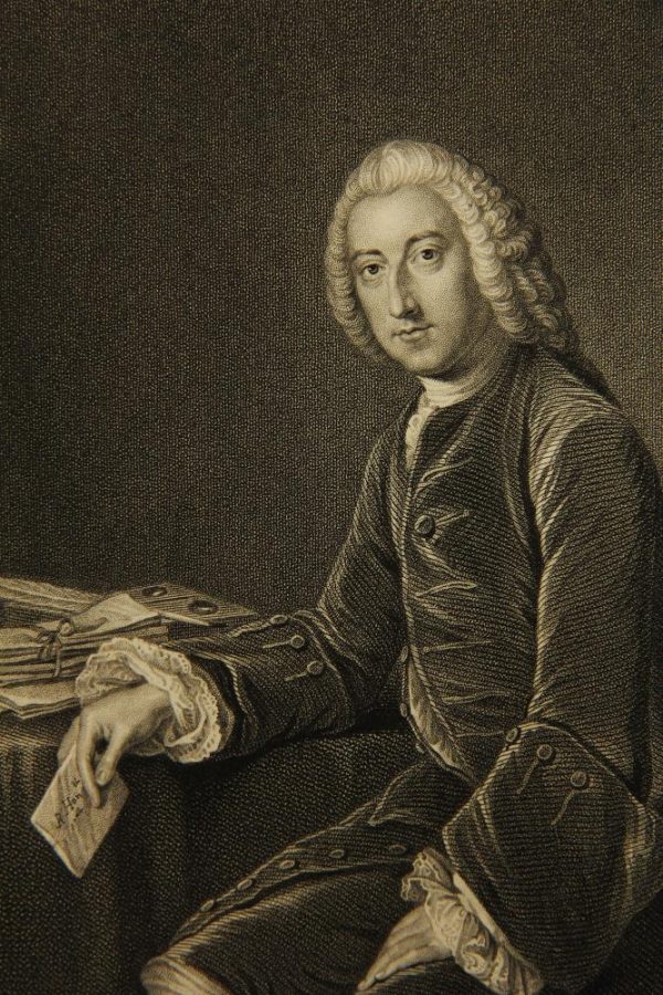 - Beschreibung: Stahlstich auf festem Papier. Nach dem Original von William Hoare of Bath (um 1707 Suffolk – 1792 Bath). Die Darstellung ist durch ornamentale Muster gerahmt und trägt oben das Wappen des Dargestellten.