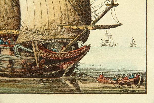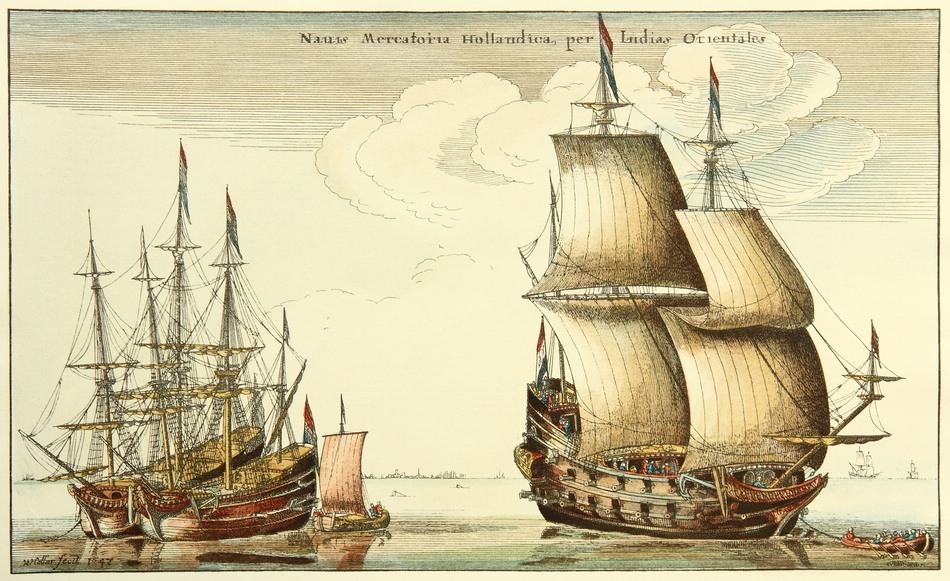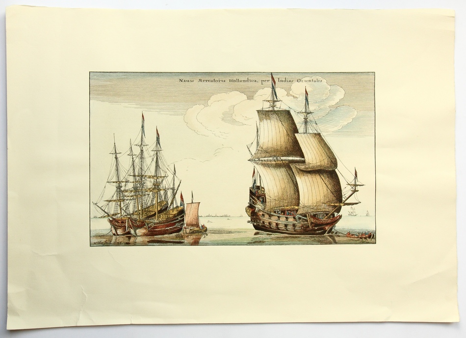 - Description: Inscribed at the top of the printing plate: “Navis Mercatoria Hollandica, per Indias Orientales”.