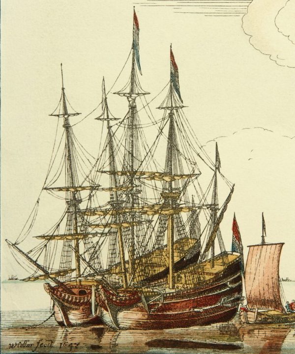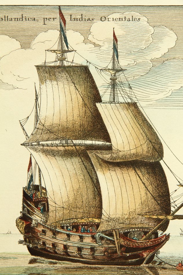- Beschreibung: Oben in der Druckplatte bezeichnet mit: “Navis Mercatoria Hollandica, per Indias Orientales”.