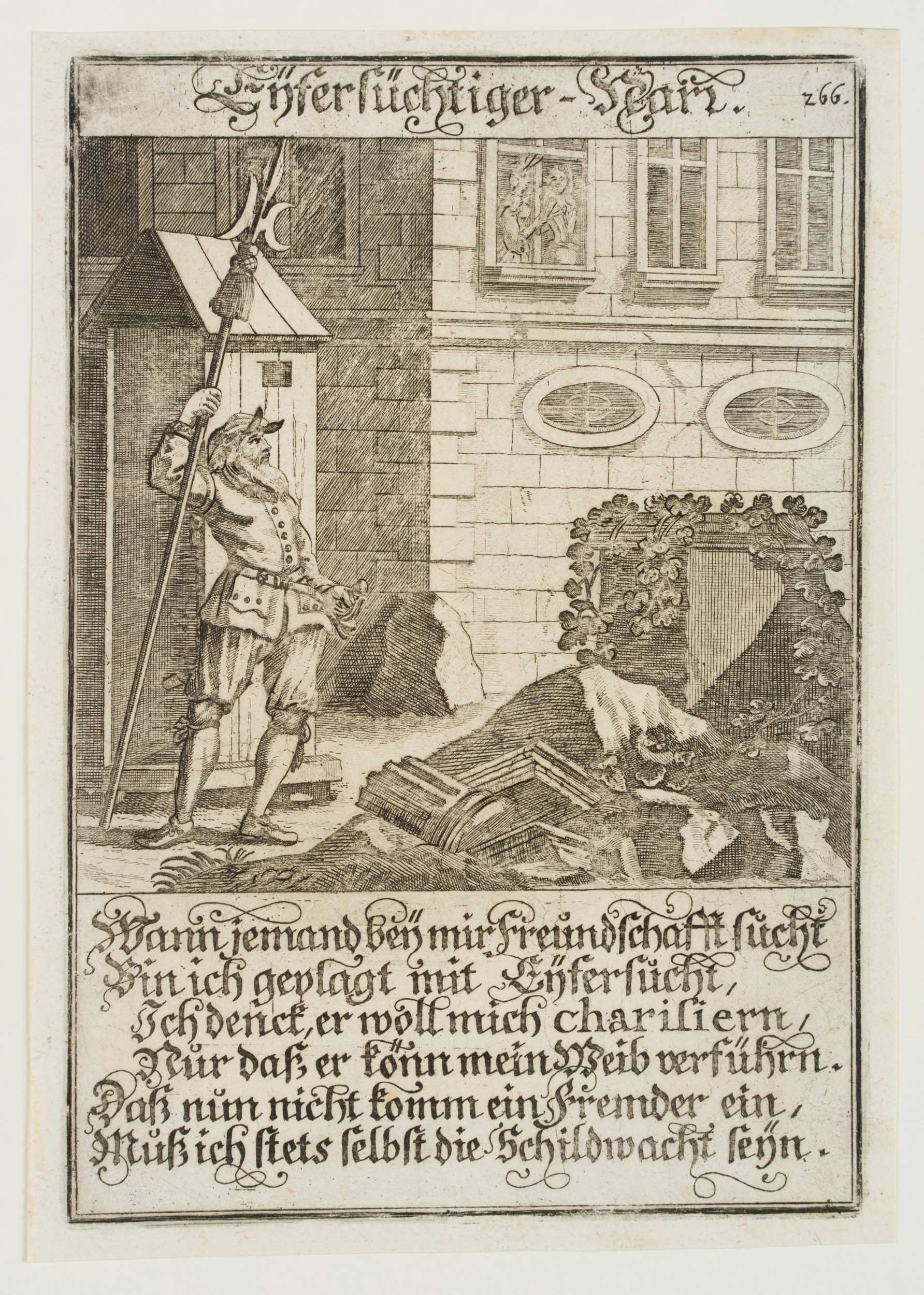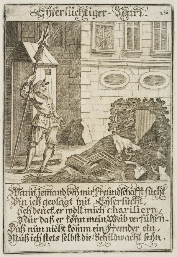 - Bezeichnung: Im Druck bezeichnet: “Eyfersüchtiger Narr / Wann jemand bey mir Freundschaft sucht / Bin ich geplagt mit Eyfersucht [..]”. Oben rechts im Druck nummeriert: “266”.