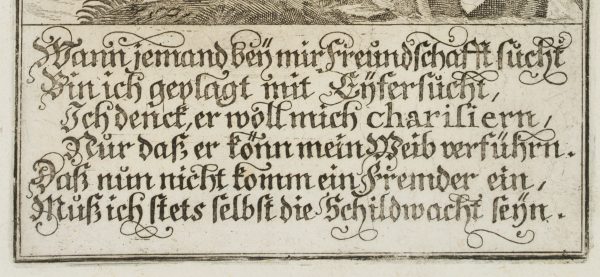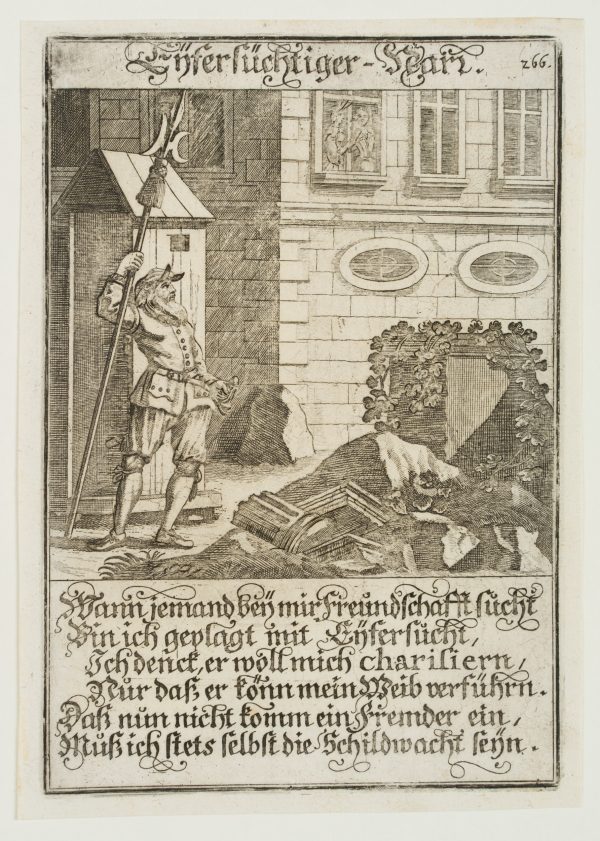 - Inscription: Inscribed in the printing plate: “Eyfersüchtiger Narr / Wann jemand bey mir Freundschaft sucht / Bin ich geplagt mit Eyfersucht […]”. Upper right numbered in the printing plate: “266”.