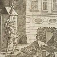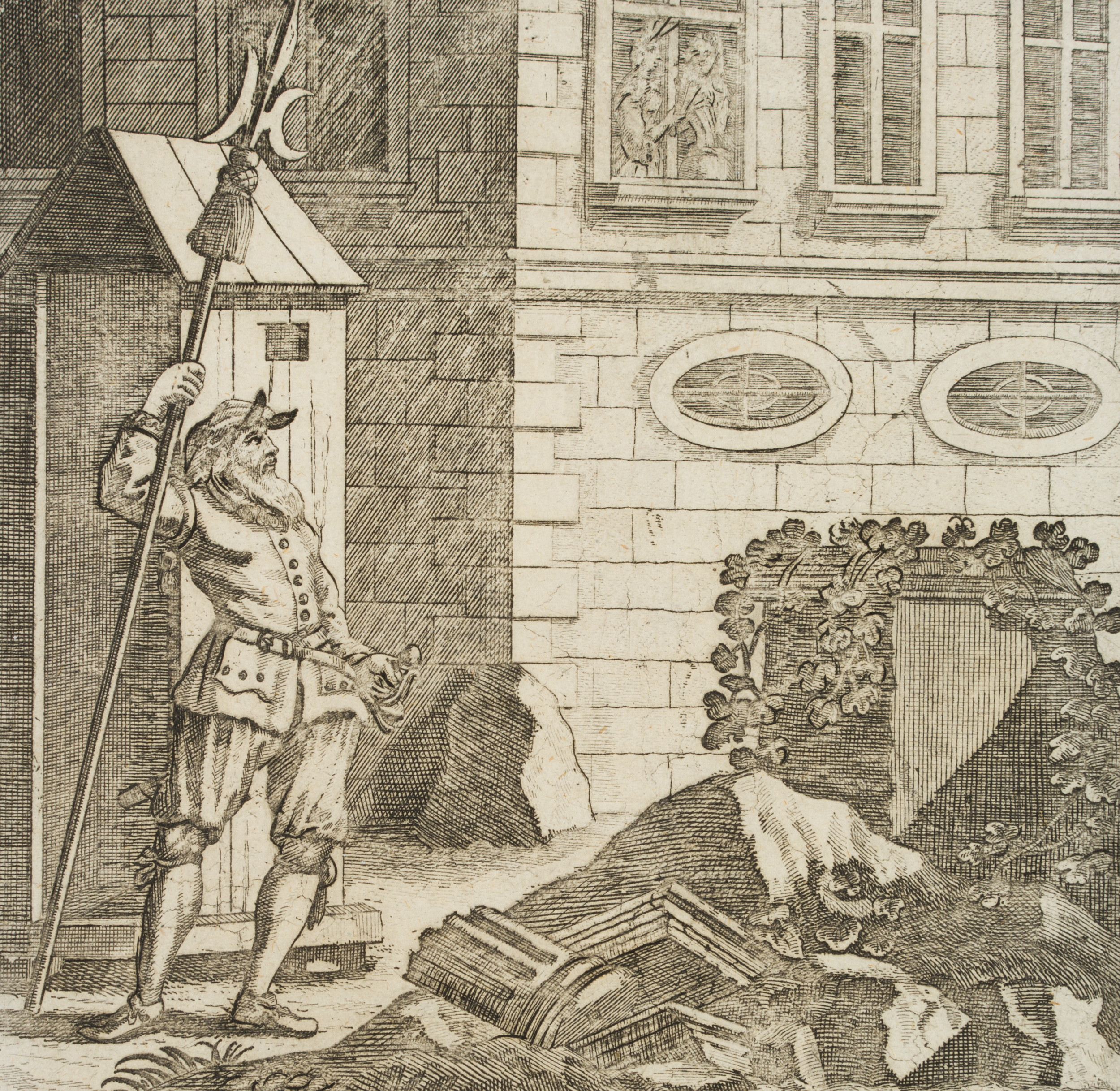 - Beschreibung: Satirische Darstellung eines eifersüchtigen Narren, als Schildwache vor dem eigenen Haus.