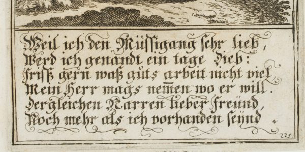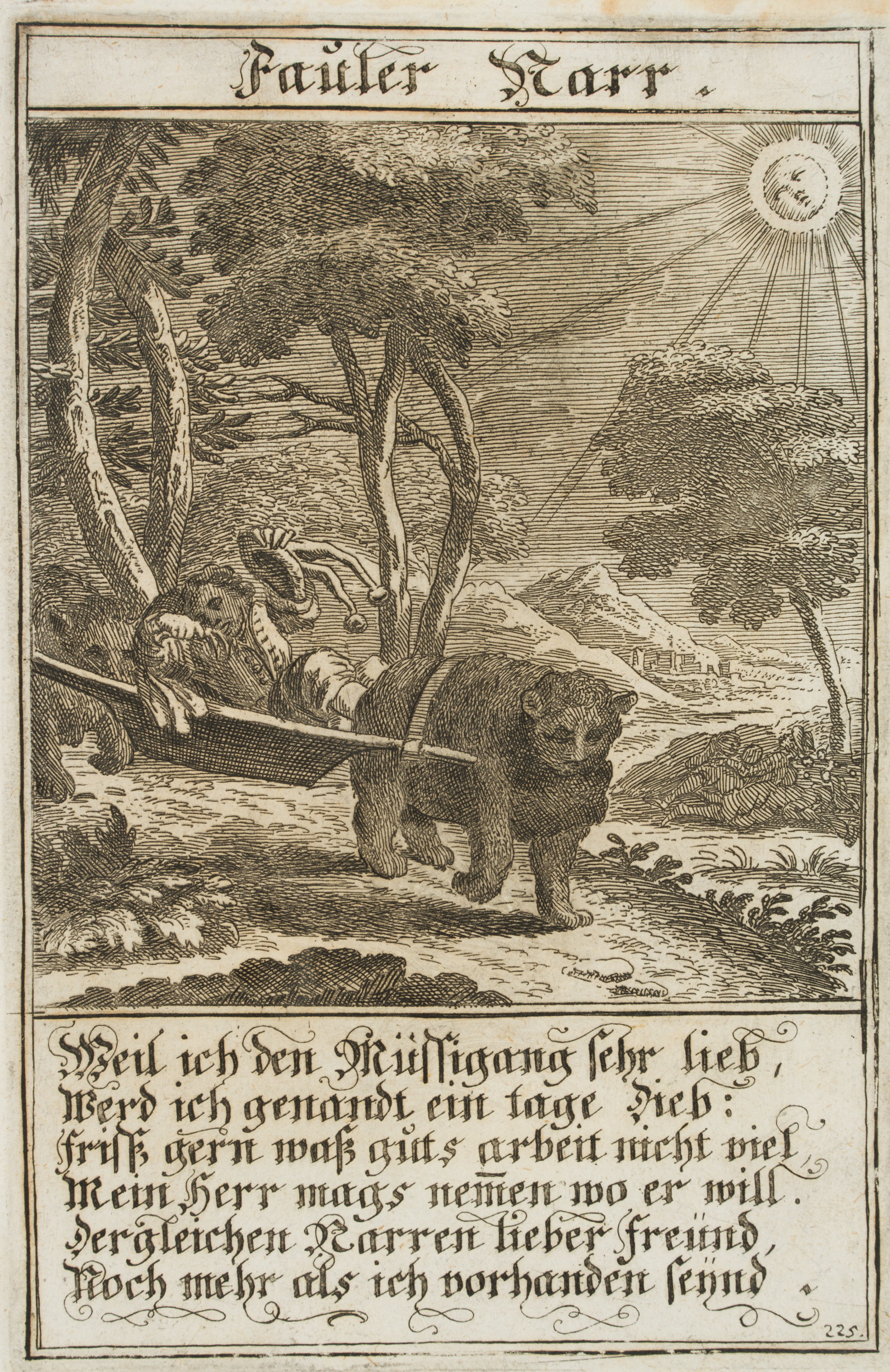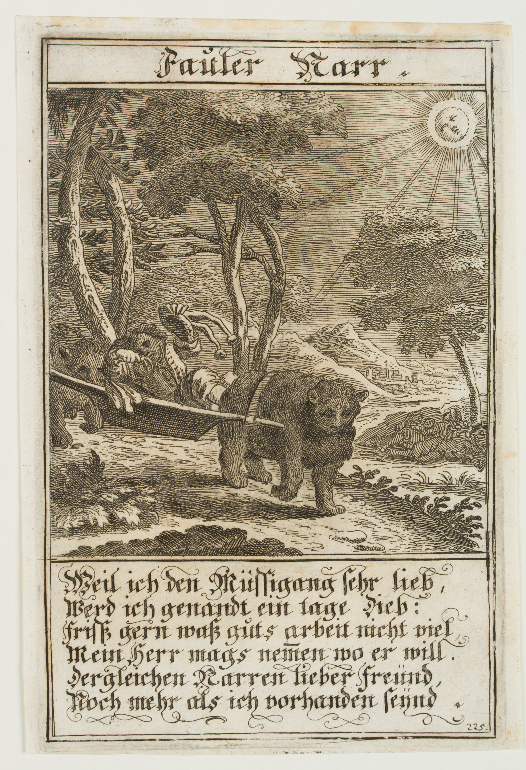 - Bezeichnung: Im Druck bezeichnet: “Fauler Narr / Weil ich den Müssigang sehr lieb, werd ich genandt ein tage dieb [..]”. Unten rechts im Druck nummeriert: “225”.