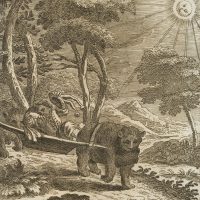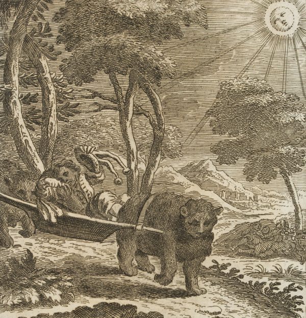 - Description: Satirical depiction of an idle fool, carried on a bier between two bears.