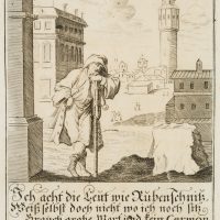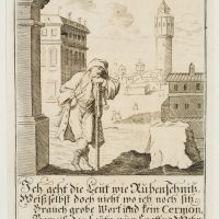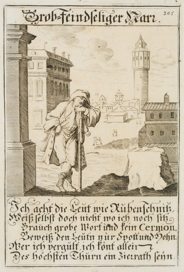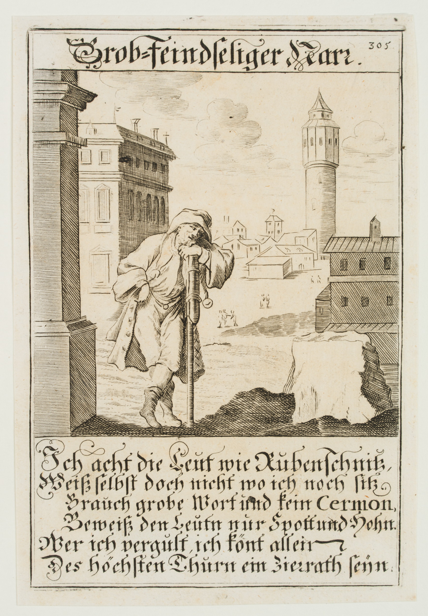 - Bezeichnung: Im Druck bezeichnet: “Grob-Feindseliger Narr / Ich acht die Leut wie Rübenschnitz, weiß selbst doch nicht wo ich noch sitz [..]”. Oben rechts im Druck nummeriert: “305”.