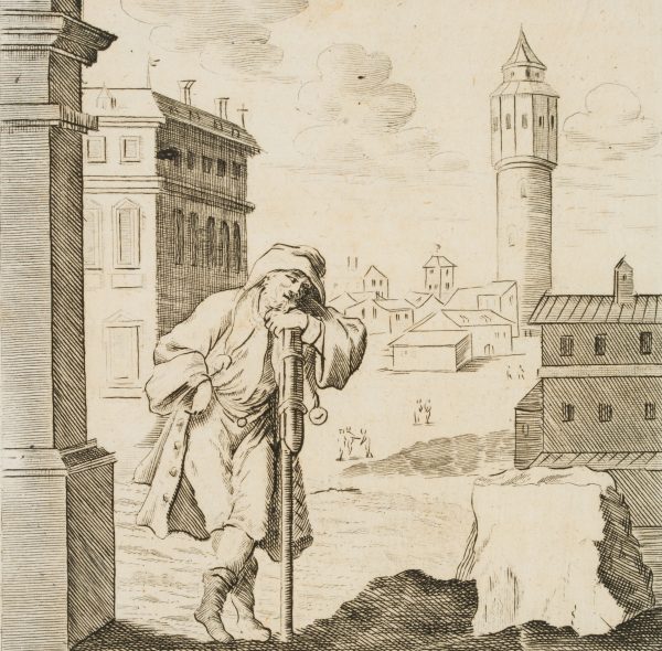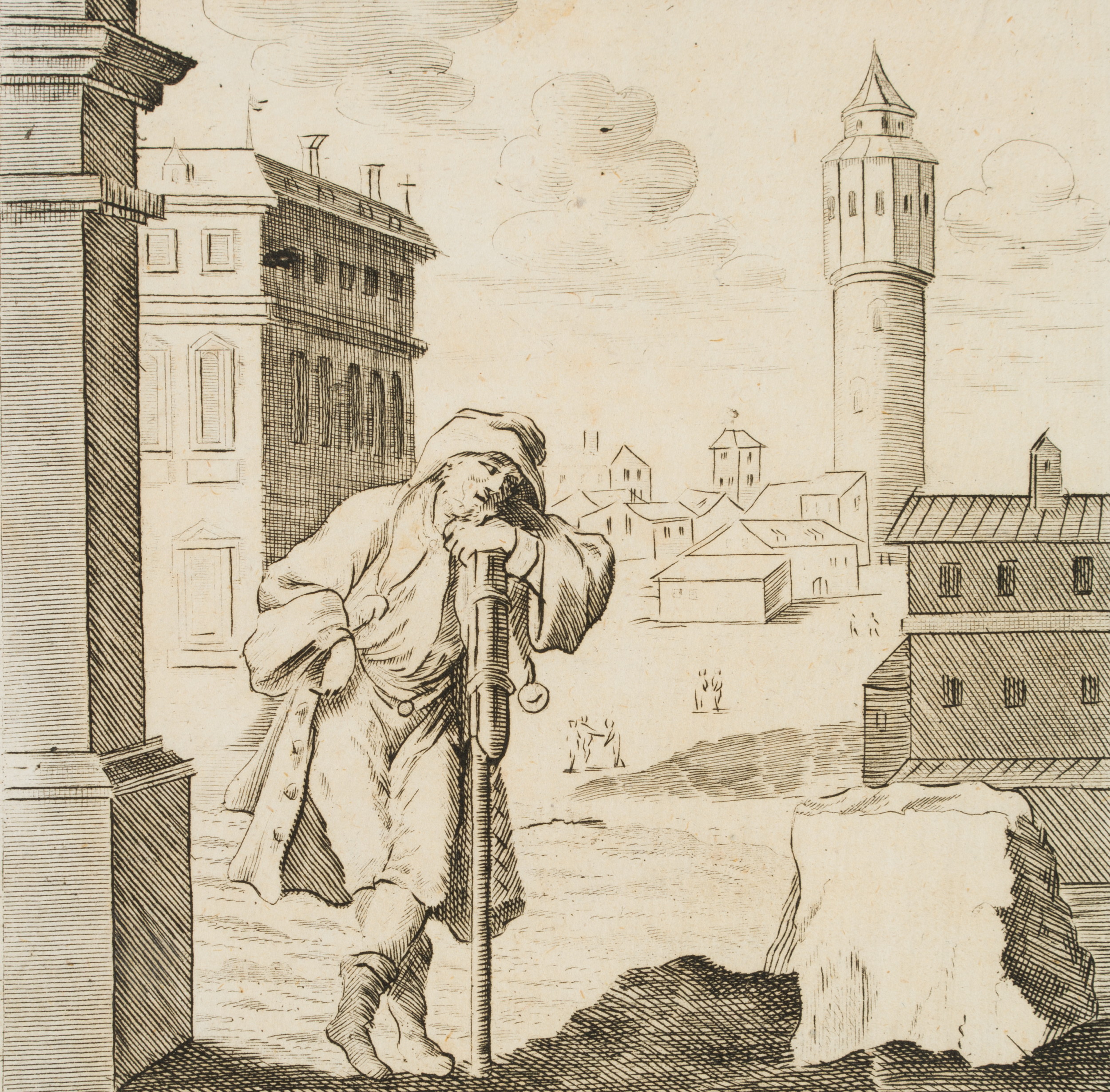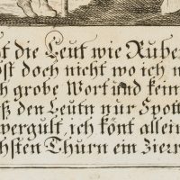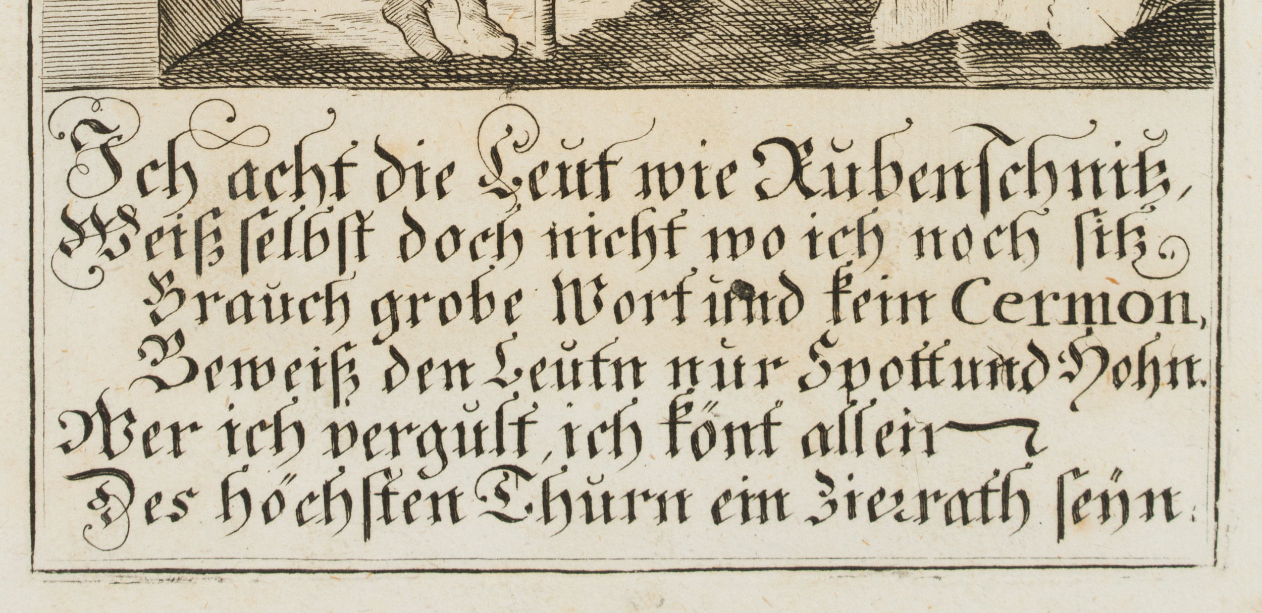 - Inscription: Inscribed in the printing plate: “Grob-Feindseliger Narr / Ich acht die Leut wie Rübenschnitz, weiß selbst doch nicht wo ich noch sitz […]”. Upper right numbered in the printing plate: “305”.