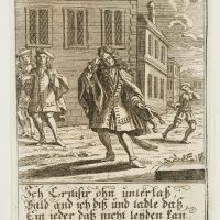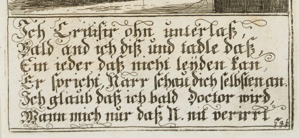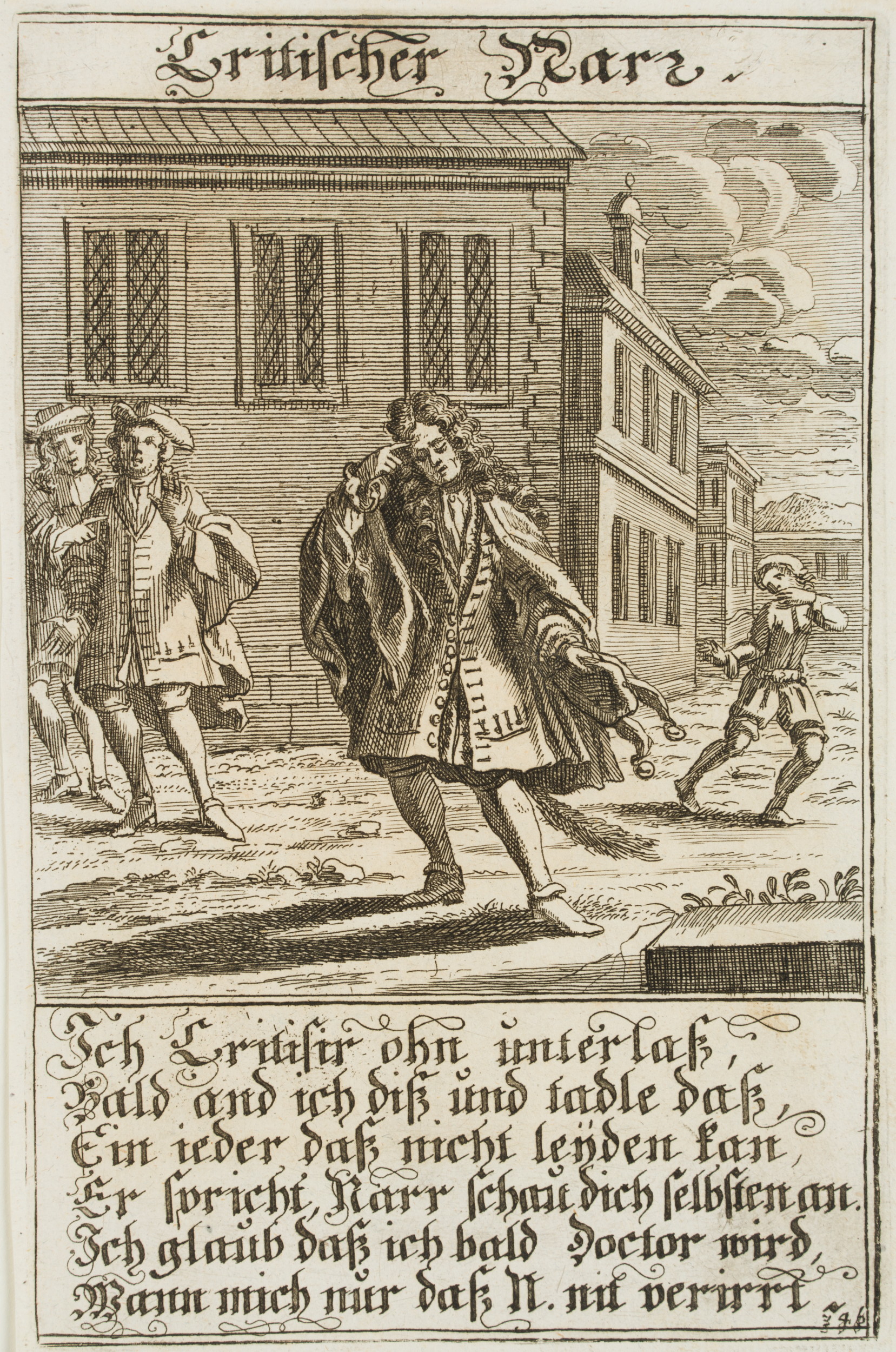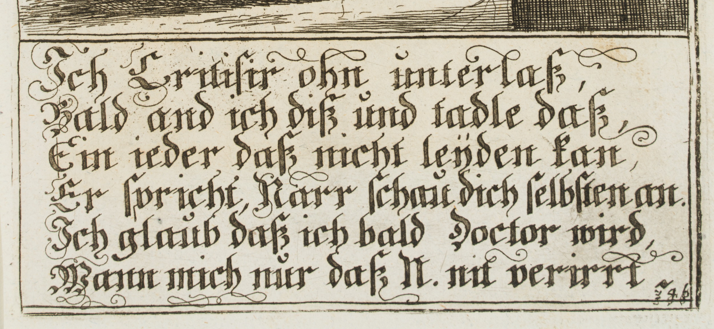- Bezeichnung: Im Druck bezeichnet: “Critischer Narr / Ich critisir ohn unterlaß, bald and ich diß und tadle daß [..]”. Unten rechts im Druck nummeriert: “346”.