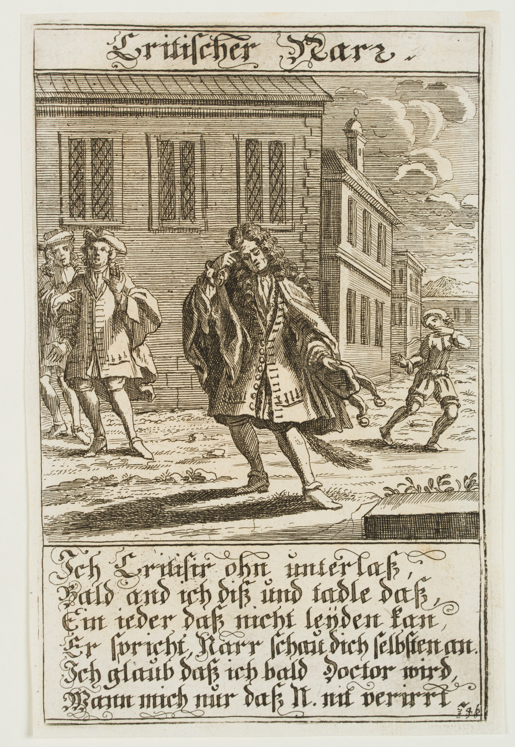 - Inscription: Inscribed in the printing plate: “Critischer Narr / Ich critisir ohn unterlaß, bald and ich diß und tadle daß […]”. Lower right numbered in the printing plate: “346”.
