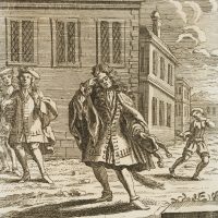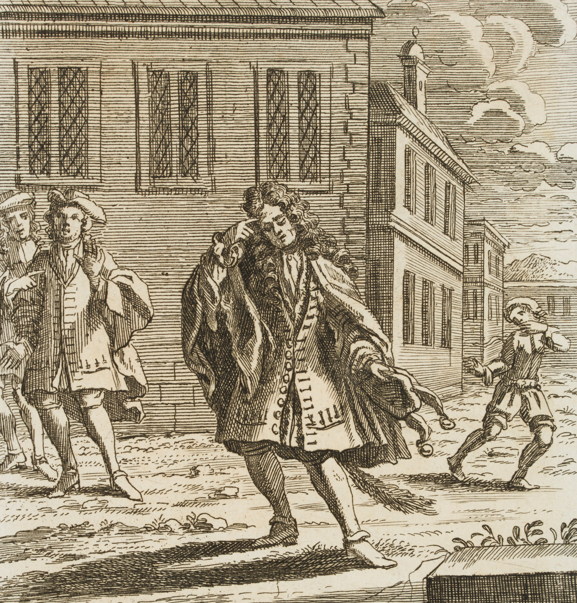 - Description: Satirical depiction of a blaming fool, walking through the streets in contemporary costume.