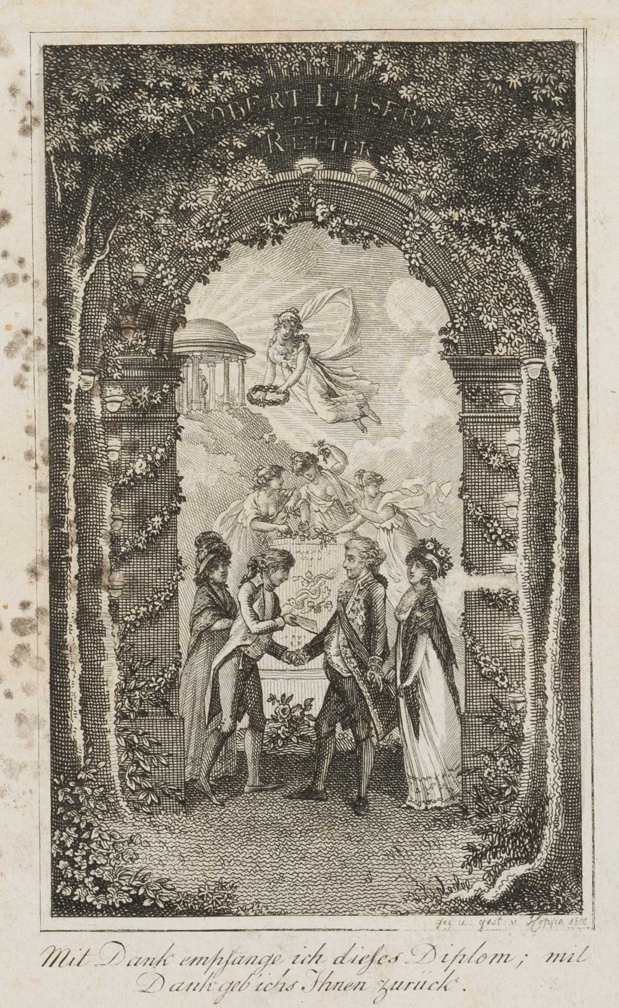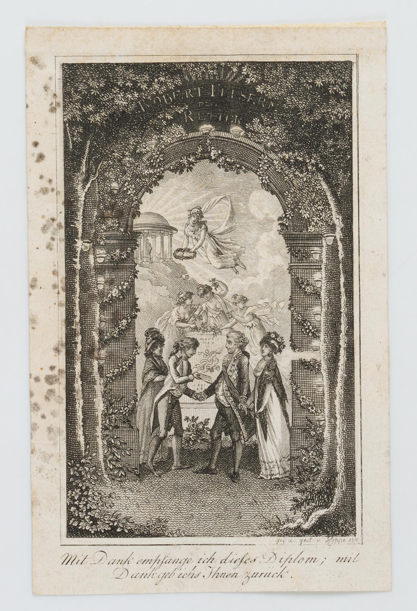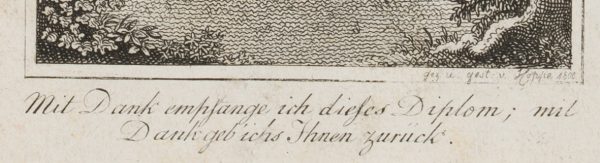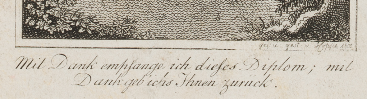 - Beschreibung: Unter der Darstellung rechts signiert und datiert “gez.u.gest. v. Hoppe 1800”, mittig darunter betitelt “Mit Dank empfange ich dieses Diplom; mit Dank geb ichs Ihnen zurück.”.