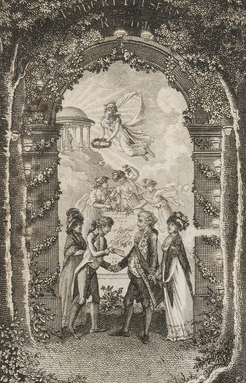 Wilhelm Johann Friedrich Hoppe (19. Jahrhundert), Die Diplomverleihung, elegant gekleidete Gesellschaft, Illustration, 1800, Radierung
