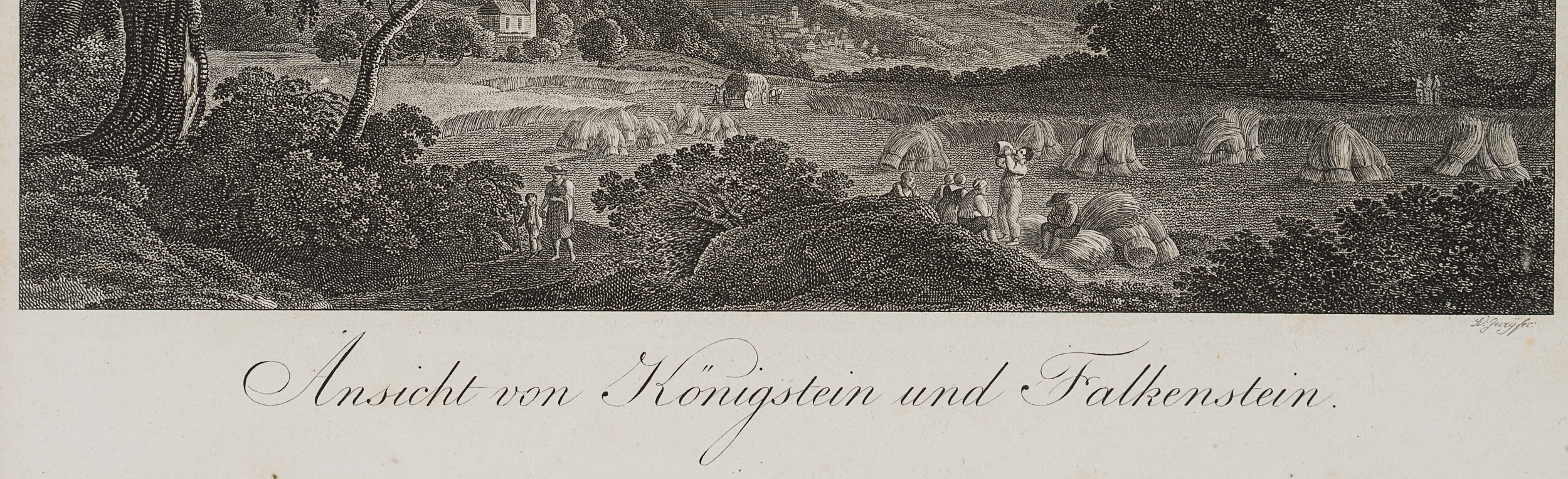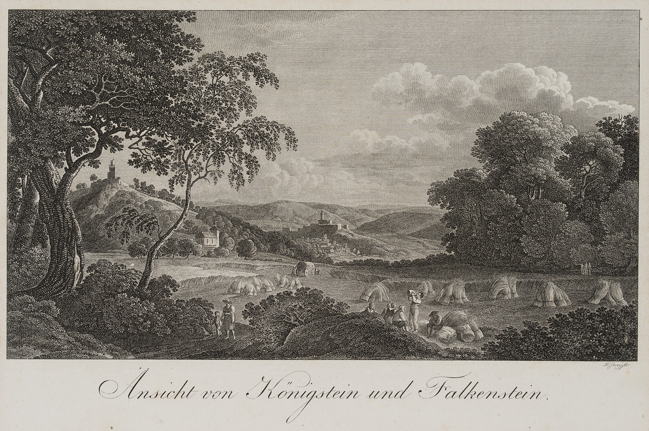 - Inscription: Lower right signed in the printing plate: “W.Jury fec.”. At the lower part inscribed in the printing plate: “Ansicht von Königstein und Falkenstein”.