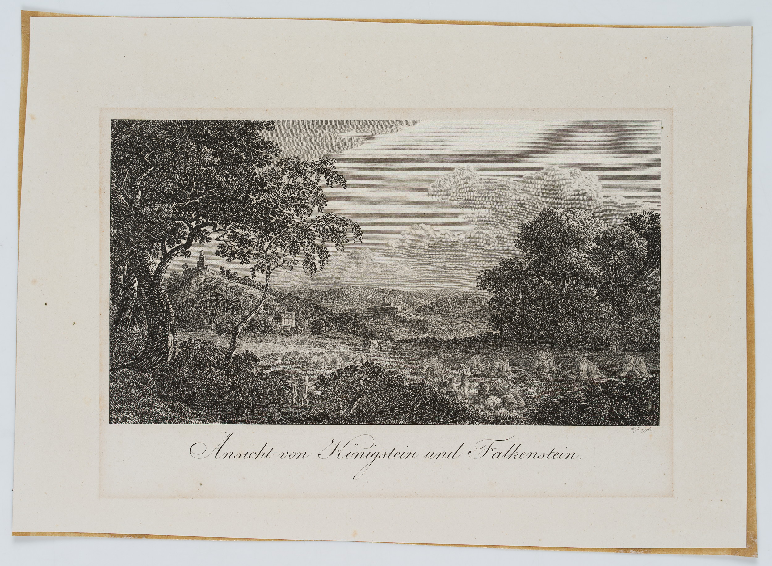 - Bezeichnung: Unten rechts im Druck signiert: “W.Jury fec.”. Unten im Druck bezeichnet: “Ansicht von Königstein und Falkenstein”.