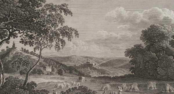 - Description: Landscape veduta with a view of the town with castle. The ruins of Falkenstein Castle can be seen on the left. In the foreground some figures in local and period costumes at the hay harvest.