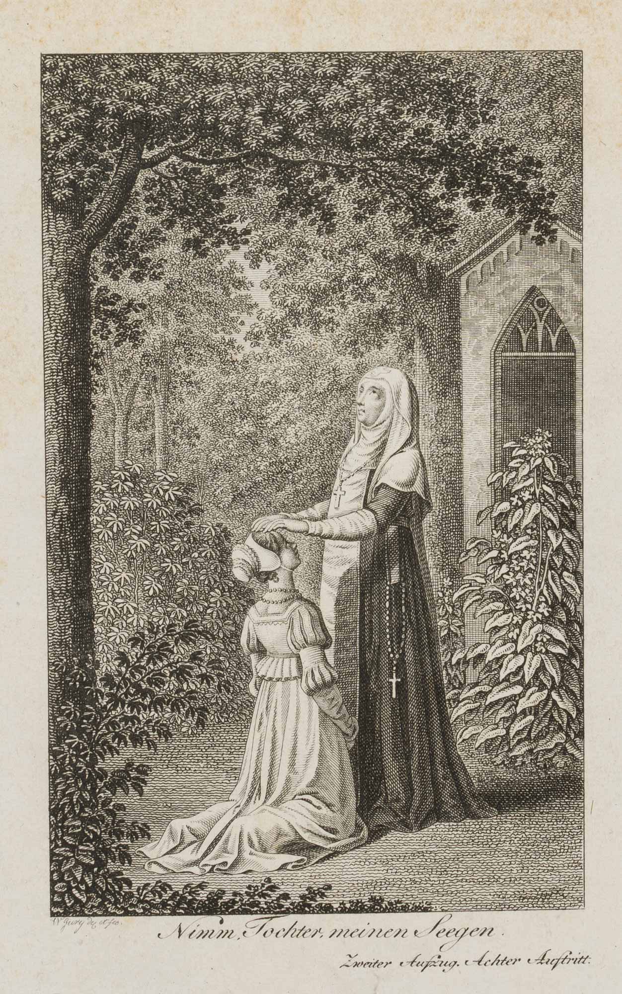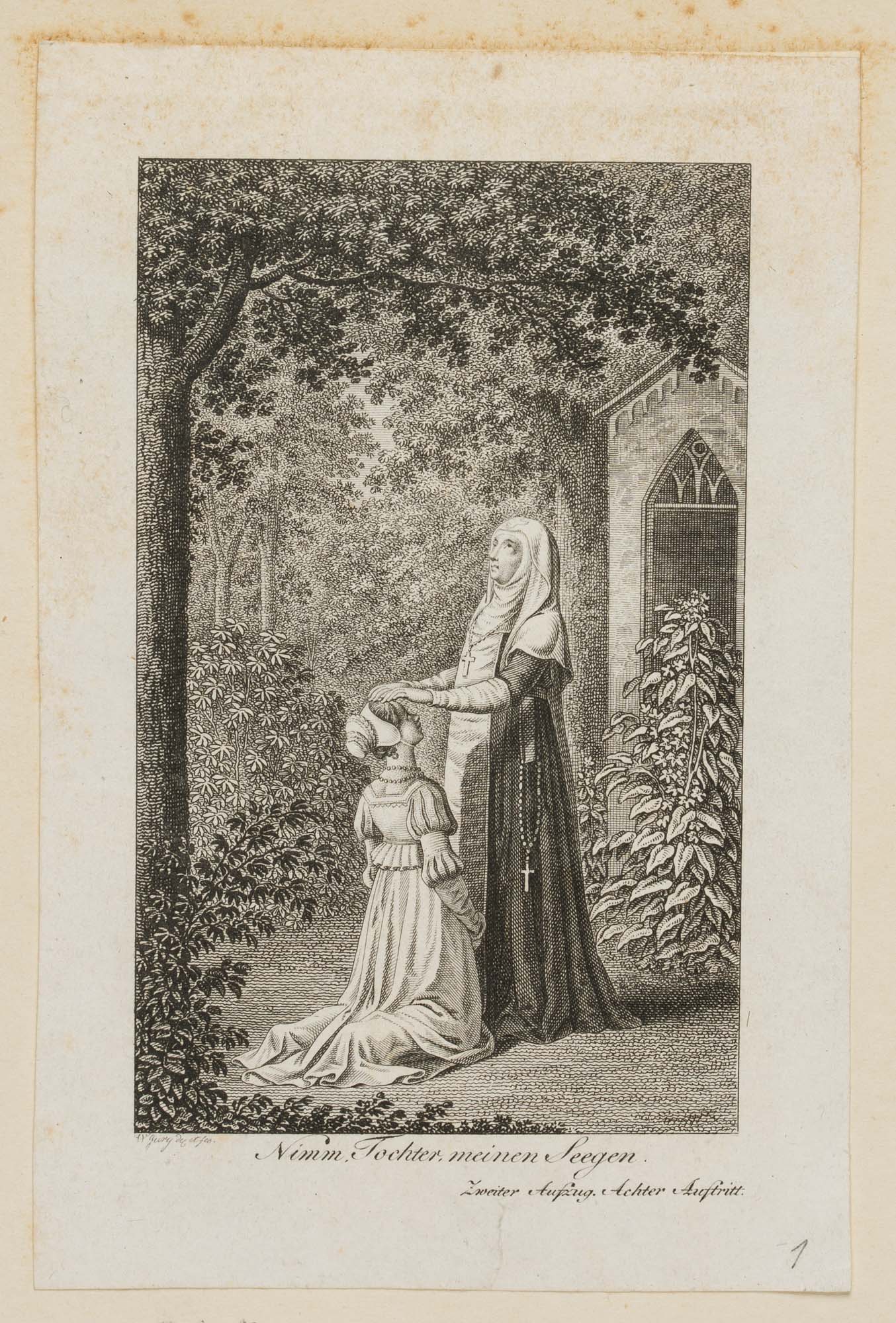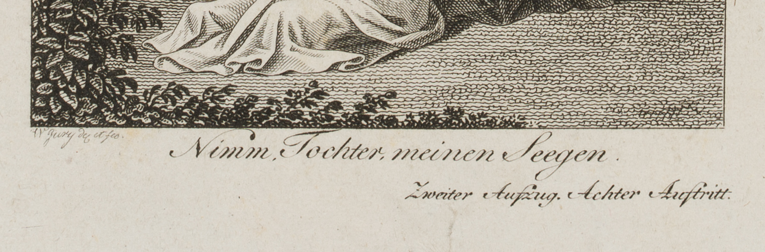 • Inscription: Signed “W. Jury del et fec.” below the image on the left. Titled in the centre below “Nimm Tochter meinen Segen. Second act. Eighth act”. Miniature and illustration of a contemporary play. From the hands of the Berlin painter, etcher and engraver Wilhelm Jury; since 1779 student at the Berlin academy and afterwards apprentice at the local procelain manufactory; he learned his trade under the famous engraver Daniel Berger from 1788 on; known for his engravings and book illustrations, one of the first “fashion artists” in book engravings, especially to novels. (Source: Thieme-Becker).