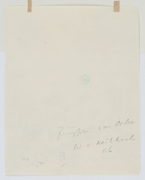 - Beschreibung: “Noch dämmert es und nur im Osten verkündet ein leichter Schein den nahenden Morgen; trotz der väterlichen Warnung hat Johanna die Nacht unter dem Lieblingsbaume zugebracht; da umgibt sie himmlisches Licht und auf goldener Wolke schwebt Maria hernieder und gürtet sie mit den Waffen gegen die Feinde des ältesten Thrones der Christenheit. In stummer Verzückung kniet Johanna vor ihr und empfängt anbetend den Segen, den ihr das Christuskind spendet. Welch’ wunderbare Milde liegt auf dem Antlitz der Heiligen, mit welch’ liebender Teilnahme blickt sie auf die Jungfrau, die ihrem Dienste sich weiht, und dagegen Johanna! wie strahlt aus ihrem Blicke die Begeisterung für die hohe Sache, zu der sie berufen; und doch finden wir in der ganzen Stellung die Demut wieder, mit der sie alles Lob von sich wies. Aber durch das leichte Gewand erkennen wir auch die herrliche Gestalt, welche den Hass Lionels in Liebe verwandelte und den unerbittlichsten Feind im englischen Lager, den Herzog von Burgund, durch die Gewalt ihrer Rede dem Könige versöhnt wieder zuführte, dass er gestand: O, sie kann mit mir schalten, wie sie will, Mein Herz ist weiches Wachs in ihrer Hand.”, Zitat aus Erwin Försters Beschreibung der Kaulbach-Johanna, die die Waffen empfängt. Rückseitig mit Sammlerstempel: “St. K” (Stefan Kaps, Enkel und Erbe von Erhard Kaps, Leipzig, L.4642).
