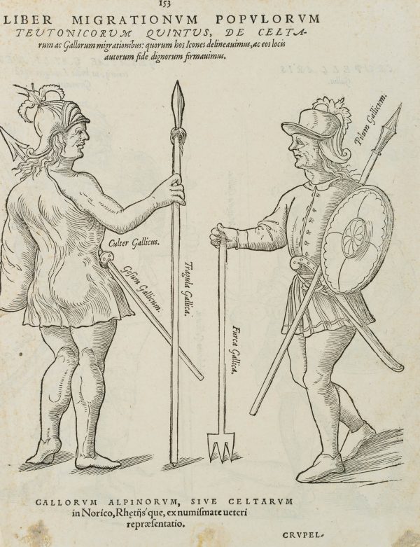 - Description: Exceptional print, page 153/154 of a book, with Latin text on verso. Titled above the illustration on page 153: “LIBER MIGRATIONUM POPULORUM”, on page 154 above the two marvellous depictions of heavily armoured gladiators inscribed: “Crupellaris Gallus”, Latin foreign word from the Gallic: “armoured swordsman”. Book illustration from the famous and very beautifully illustrated chronicle of the early European tribes up to the 15th century: “De aliquot gentium migrationibus sedibus fixis, reliquiis, linguarumque, initiis (et) immutationibus ac dialectis”, Basel, 1557 (about the migration of peoples). The work is a valuable source of information on the early history of European tribes, taking into account their customs and social structures as well as their religious beliefs. It also includes early references to figures from the Nibelungenlied. The work is illustrated with twenty-one exceptional woodcuts based on drawings by the author.