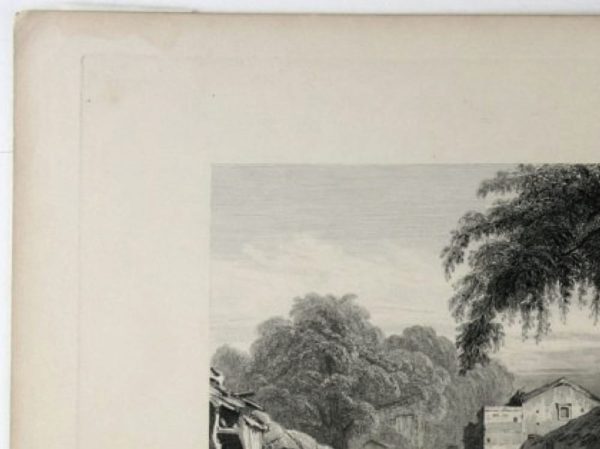 - Beschreibung: Stahlstich von William Le Petit nach W. Purser, bezeichnet: “Drawn by W. Purser Sketches by Capt. R. Elliot, R. N. Engraved by W. Le Petit The Pass of Makundra Fisher, Son&C° London, 1833”. Sehr schöne Darstellung einer indischen Landschaft mit mächtigen Bäumen und zerfallenen Häusern am Wegesrand. William Le Petit war britischer Kupfer- und Stahlstecher. Er war von etwa 1829 – 1857 aktiv.