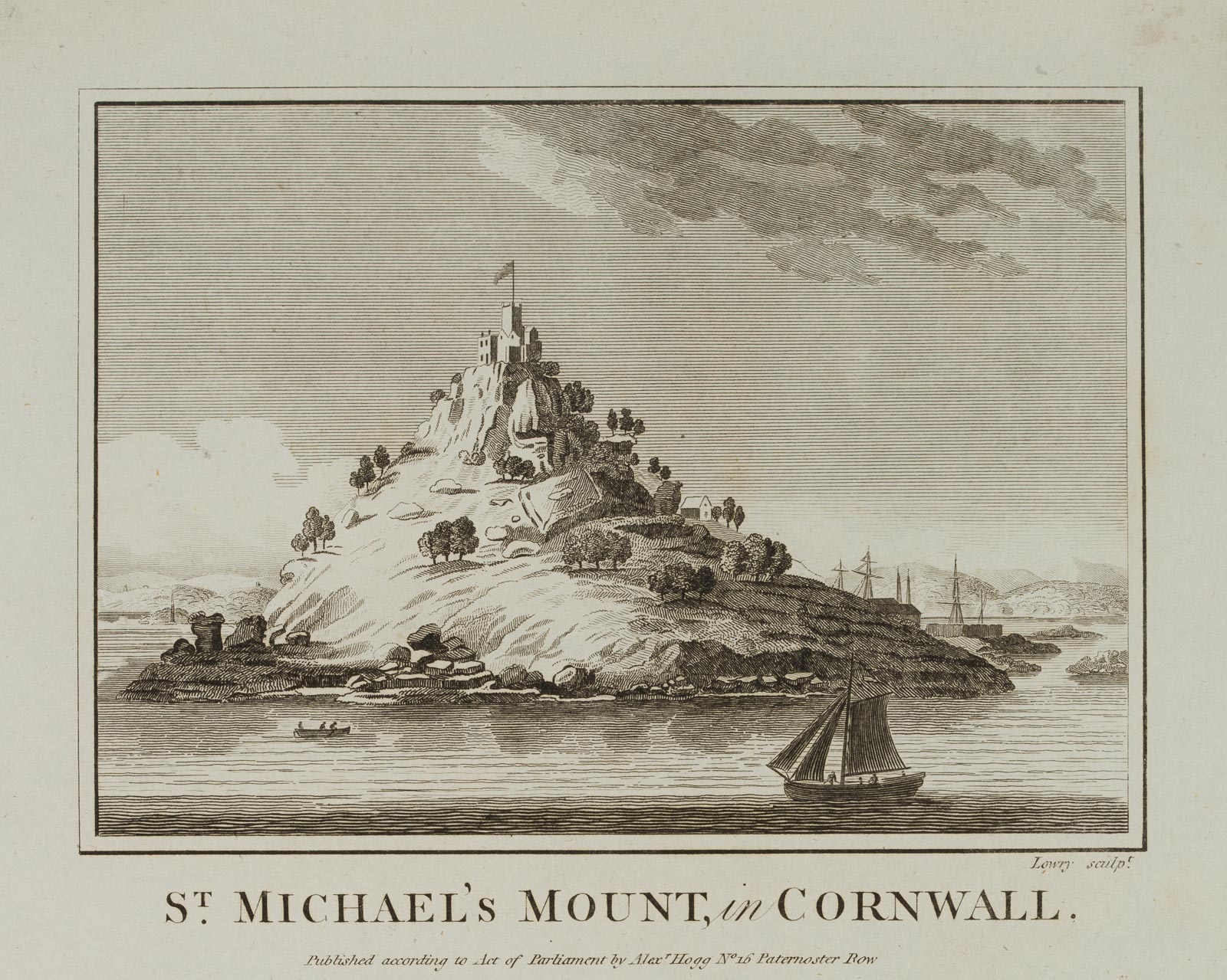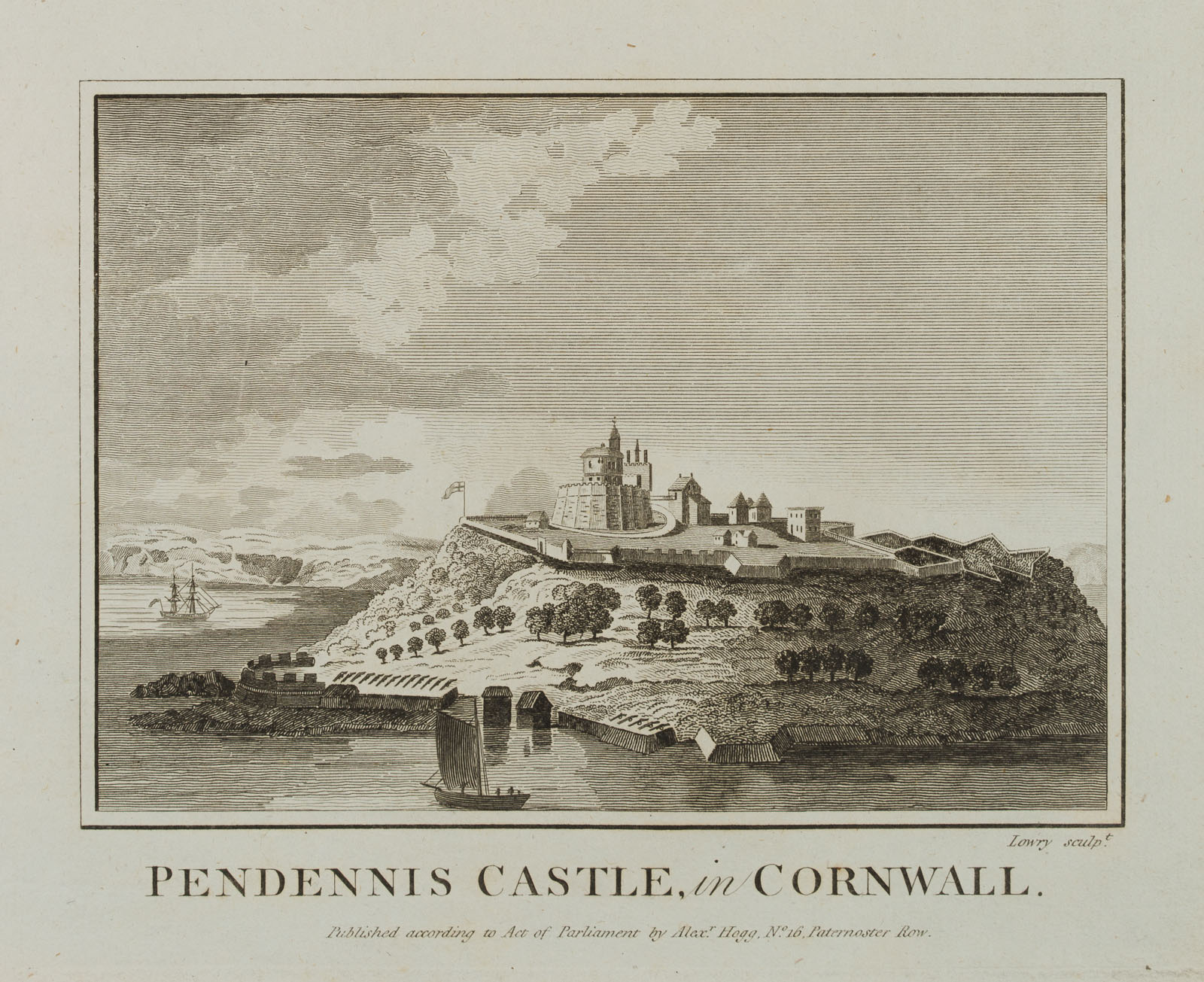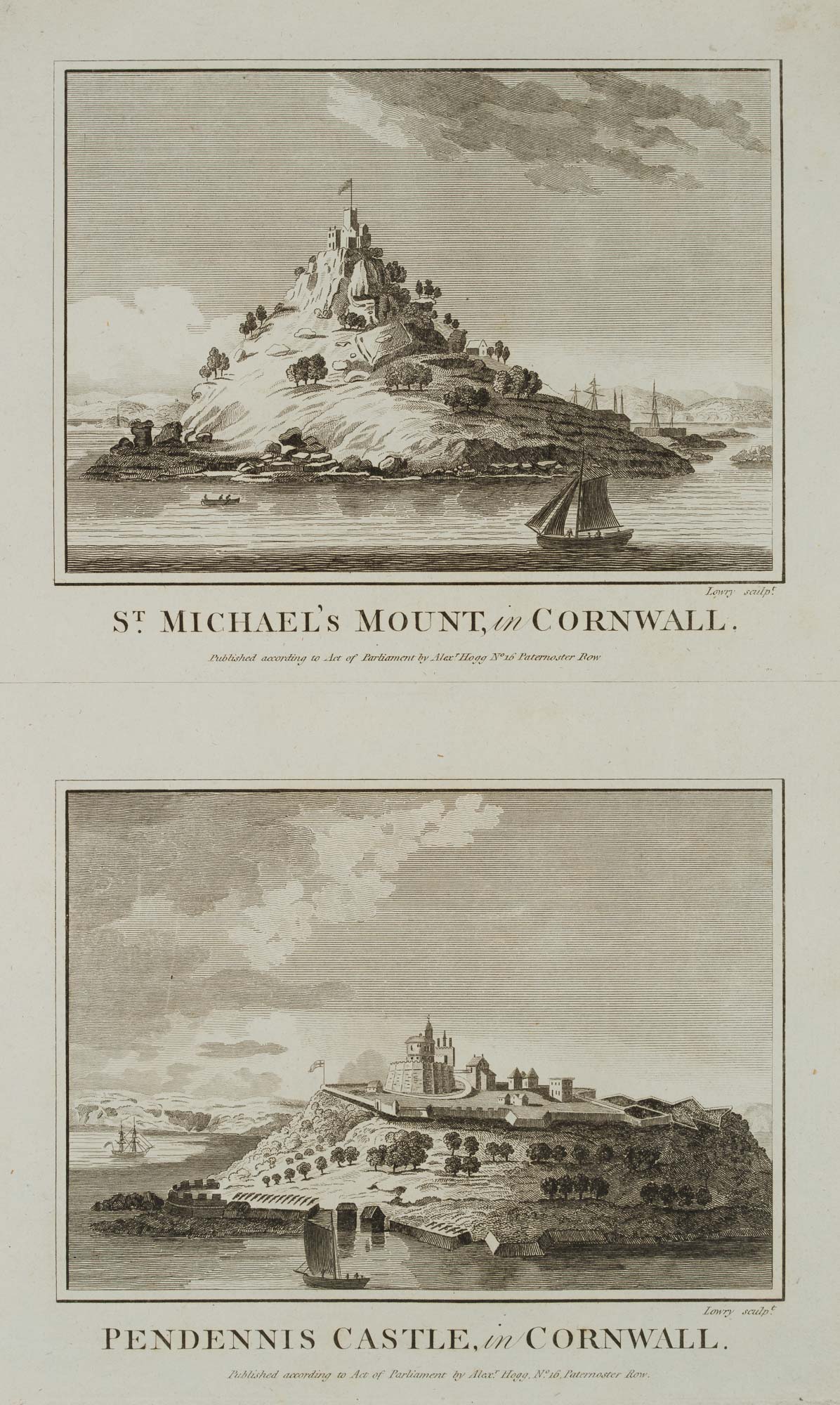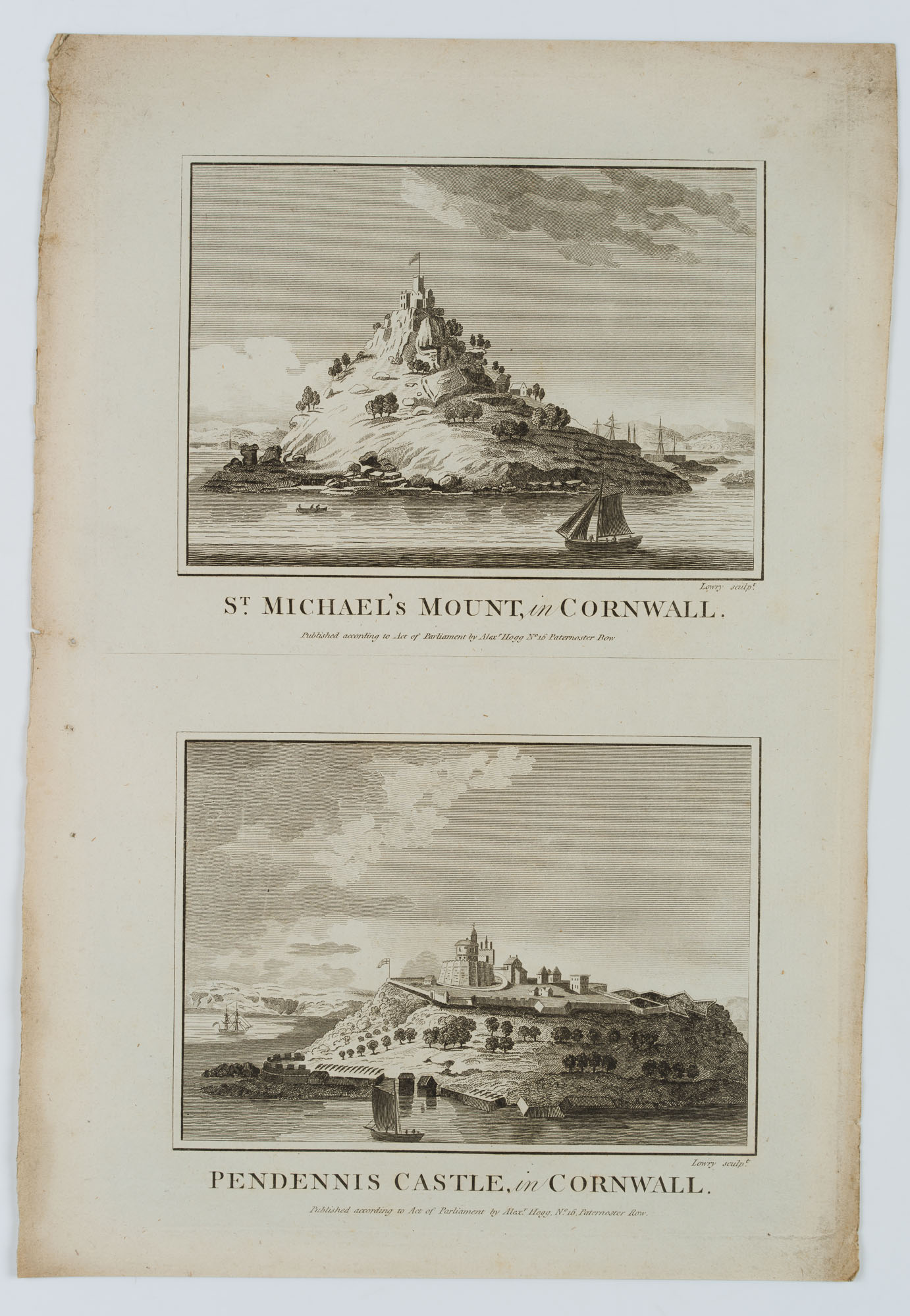 Wilson Lowry (1762 – 1824 ), Two architectural and landscape depictions: “St Michael’s Mount, in Cornwall”, “Pendennis Castle, in Cornwall”, 18th century, Etching