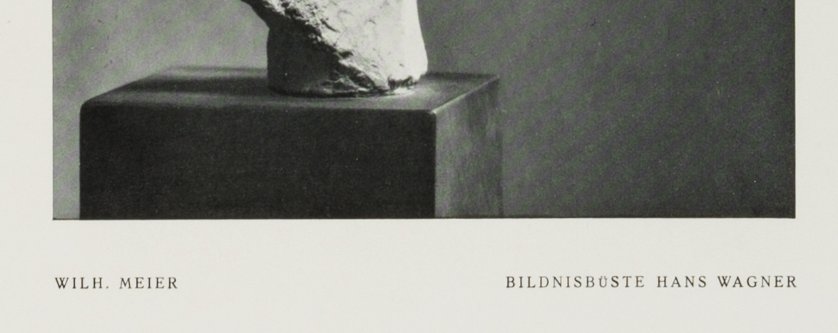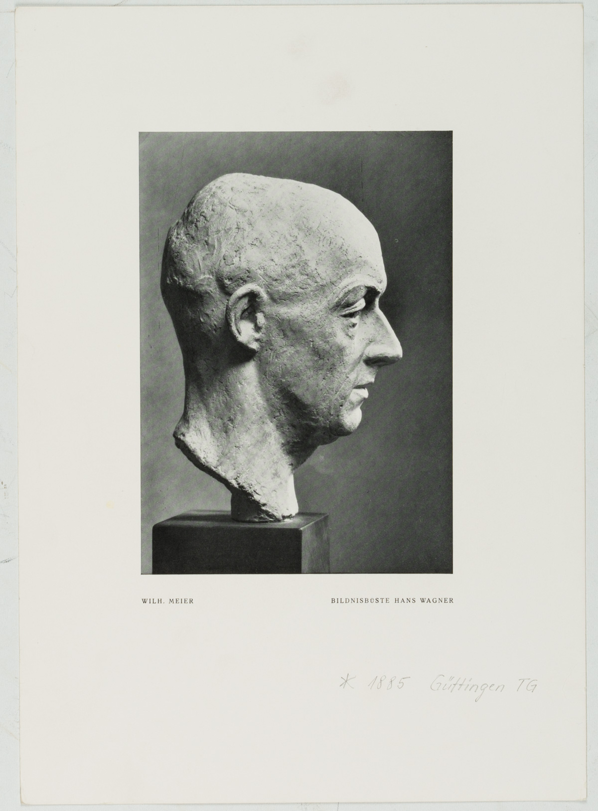- Description: inscribed lower left “Wilh. Meier”, titled “Portrait Bust of Hans Wagner”. Photograph of the portrait bust of Hans WAGNER. Captured in strict profile, the striking and charackteristic facial features of the sitter are particularly elaborated. Born in Affeltrangen, Austria, in 1885, Hans WAGNER attended the School of Applied Arts in Munich. In the autumn of 1913 he acquired a patent as a drawing teacher for Switzerland. Numerous sketches, drawings and prints have been preserved, which Wagner produced in a wide variety of media – such as charcoal, watercolour or as woodcuts.