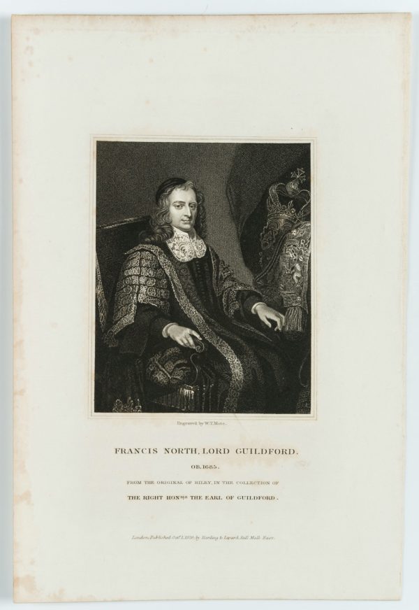 - Bezeichnung: Unten signiert und betitelt: “Francis North, Lord Guildford. OB. 1685. From the Original of Riley. in the collection of The Right Honble. The Earl of Guildford.”