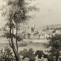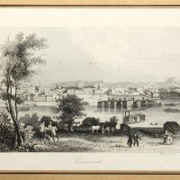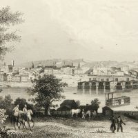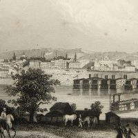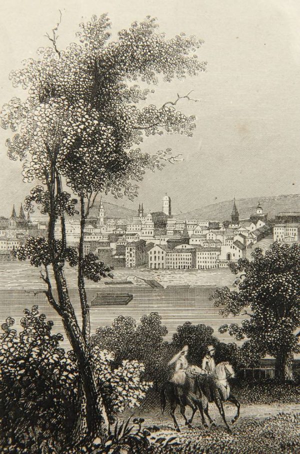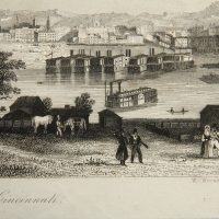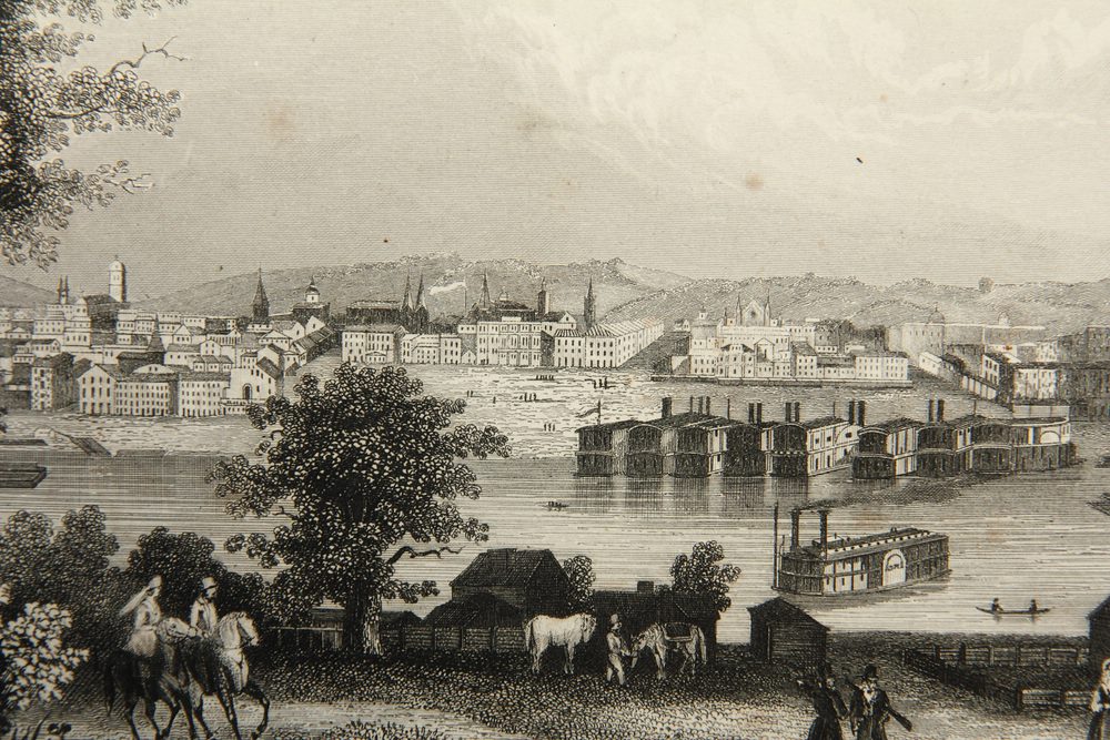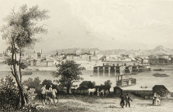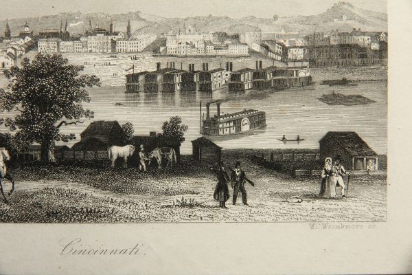 - Description: Beautiful city view on the bank of the Ohio River with some river paddle steamers. In the foreground are some middle-class strollers and a couple on horseback. Signed and inscribed by the artist below the image in the printing plate.
